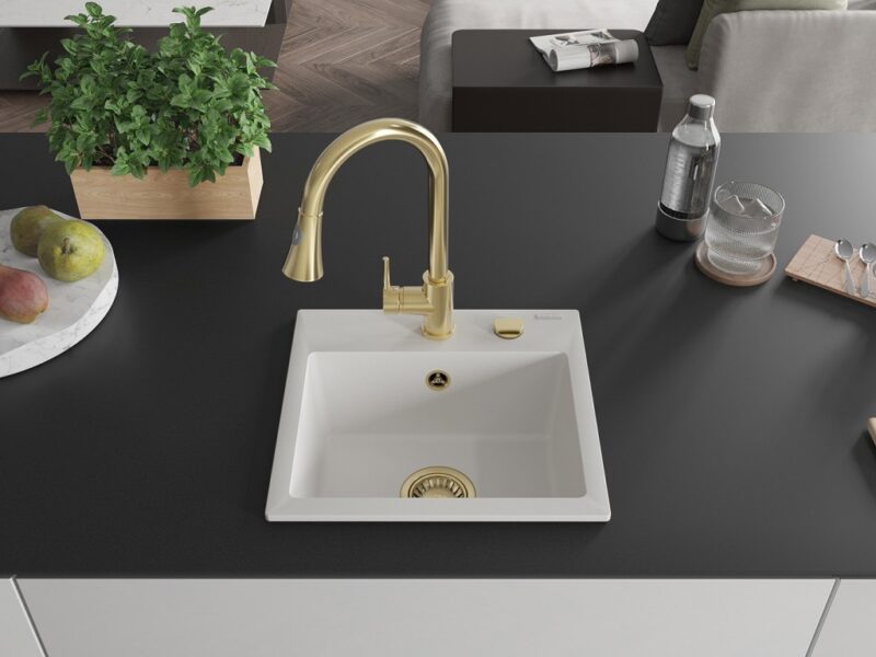 Technické dáta: drez: Rozmer: 435x410x171mm Hĺbka komory: 161 mm Rozmery komory: 375×280 mm Priemer odtoku: ø90 mm Typ: 1-komorový Typ: Zapustené do pracovnej dosky biela farba Povrchová úprava sifónu: zlatá Materiál: žula (80% žulové kamenivo, 20% živice) Prepadový otvor: Áno Otvory: (batérie, automatické) 2 Vysoká odolnosť proti poškriabaniu a zmene farby Odolnosť proti tepelným šokom Ľahko čistiteľný povrch Jeden dodatočný vyfrézovaný otvor na samodierovanie ø35 kuchynská batéria: Materiál: mosadz Farba: Zlatá Hlava: Keramická Prevzdušňovač: Áno Typ: Jedna páka Výška batérie: 380 mm Rozsah výtoku: 252 mm Typ výtoku: Výsuvný(GT) Ean: 5905315028426