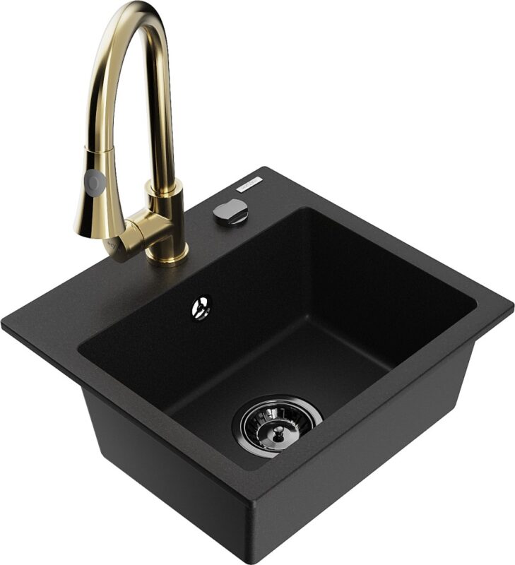 Technické dáta: drez: Rozmer: 435x410x171mm Hĺbka komory: 161 mm Rozmery komory: 375×280 mm Priemer odtoku: ø90 mm Typ: 1-komorový Typ: Zapustené do pracovnej dosky Čierna farba Povrchová úprava sifónu: čierna Materiál: žula (80% žulové kamenivo, 20% živice) Prepadový otvor: Áno Otvory: (batérie, automatické) 2 Vysoká odolnosť proti poškriabaniu a zmene farby Odolnosť proti tepelným šokom Ľahko čistiteľný povrch Jeden dodatočný vyfrézovaný otvor na samodierovanie ø35 kuchynská batéria: Materiál: mosadz Farba: Zlatá Hlava: Keramická Prevzdušňovač: Áno Typ: Jedna páka Výška batérie: 380 mm Rozsah výtoku: 252 mm Typ výtoku: Výsuvný(GT) Ean: 5905315028709