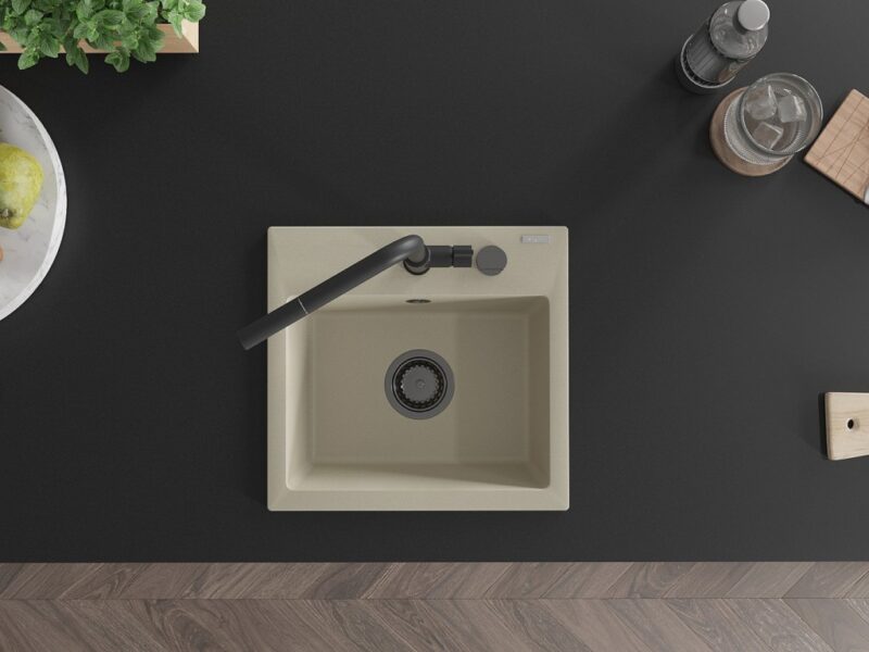 Technické dáta: drez: Rozmer: 435x410x171mm Hĺbka komory: 161 mm Rozmery komory: 375×280 mm Priemer odtoku: ø90 mm Typ: 1-komorový Typ: Zapustené do pracovnej dosky Farba béžová Povrchová úprava sifónu: čierna Materiál: žula (80% žulové kamenivo, 20% živice) Prepadový otvor: Áno Otvory: (batérie, automatické) 2 Vysoká odolnosť proti poškriabaniu a zmene farby Odolnosť proti tepelným šokom Ľahko čistiteľný povrch Jeden dodatočný vyfrézovaný otvor na samodierovanie ø35 kuchynská batéria: Materiál: mosadz Čierna farba Hlava: Keramická Prevzdušňovač: Áno Typ: Jedna páka Rozsah výtoku: 245 mm Výška batérie: 307 mm(GT) Ean: 5905315058096