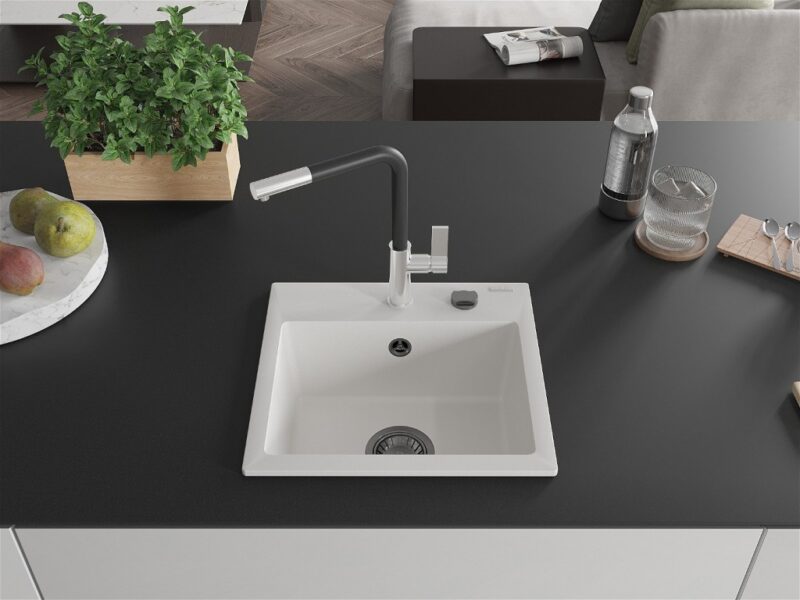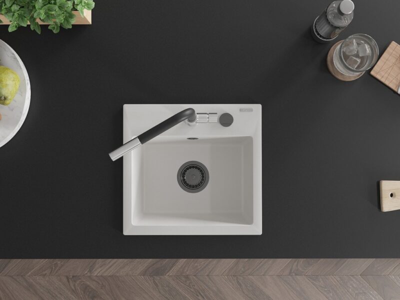 Technické dáta: drez: Rozmer: 435x410x171mm Hĺbka komory: 161 mm Rozmery komory: 375×280 mm Priemer odtoku: ø90 mm Typ: 1-komorový Typ: Zapustené do pracovnej dosky biela farba Povrchová úprava sifónu: čierna Materiál: žula (80% žulové kamenivo, 20% živice) Prepadový otvor: Áno Otvory: (batérie, automatické) 2 Vysoká odolnosť proti poškriabaniu a zmene farby Odolnosť proti tepelným šokom Ľahko čistiteľný povrch Jeden dodatočný vyfrézovaný otvor na samodierovanie ø35 kuchynská batéria: Materiál: mosadz Farba: chróm/čierna Hlava: Keramická Prevzdušňovač: Áno Typ: Jedna páka Rozsah výtoku: 245 mm Výška batérie: 307 mm(GT) Ean: 5905315057990