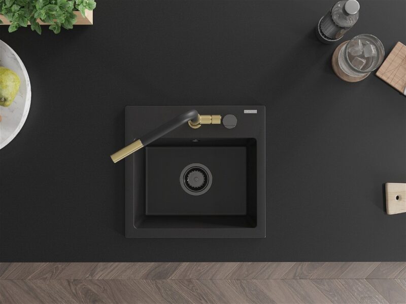 Technické dáta: drez: Rozmer: 435x410x171mm Hĺbka komory: 161 mm Rozmery komory: 375×280 mm Priemer odtoku: ø90 mm Typ: 1-komorový Typ: Zapustené do pracovnej dosky Čierna farba Povrchová úprava sifónu: čierna Materiál: žula (80% žulové kamenivo, 20% živice) Prepadový otvor: Áno Otvory: (batérie, automatické) 2 Vysoká odolnosť proti poškriabaniu a zmene farby Odolnosť proti tepelným šokom Ľahko čistiteľný povrch Jeden dodatočný vyfrézovaný otvor na samodierovanie ø35 kuchynská batéria: Materiál: mosadz Farba: Zlatá/Čierna Hlava: Keramická Prevzdušňovač: Áno Typ: Jedna páka Rozsah výtoku: 245 mm Výška batérie: 307 mm(GT) Ean: 5905315058430