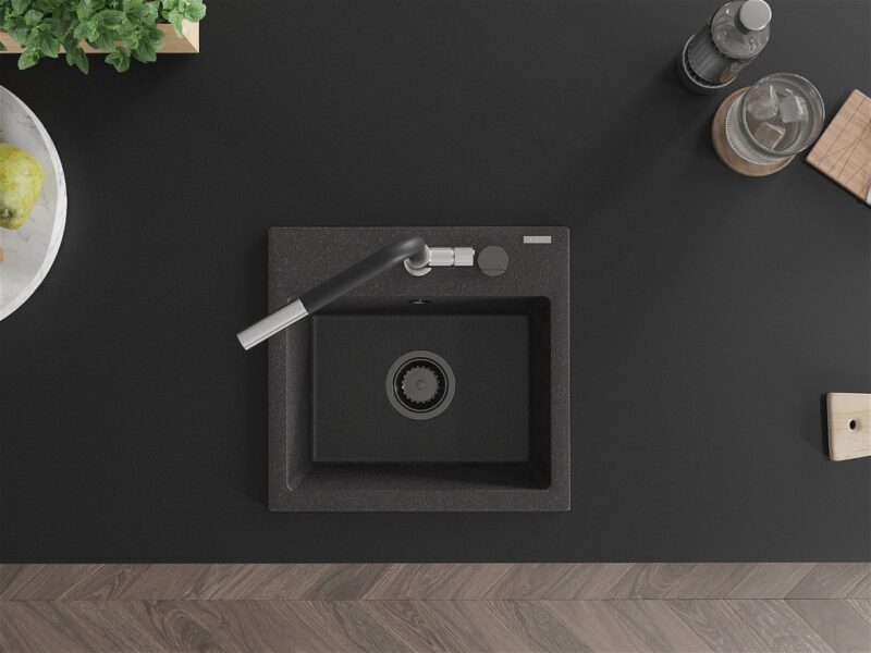 Technické dáta: drez: Rozmer: 435x410x171mm Hĺbka komory: 161 mm Rozmery komory: 375×280 mm Priemer odtoku: ø90 mm Typ: 1-komorový Typ: Zapustené do pracovnej dosky Farba: Škvrnitá čierna Povrchová úprava sifónu: čierna Materiál: žula (80% žulové kamenivo, 20% živice) Prepadový otvor: Áno Otvory: (batérie, automatické) 2 Vysoká odolnosť proti poškriabaniu a zmene farby Odolnosť proti tepelným šokom Ľahko čistiteľný povrch Jeden dodatočný vyfrézovaný otvor na samodierovanie ø35 kuchynská batéria: Materiál: mosadz Farba: chróm/čierna Hlava: Keramická Prevzdušňovač: Áno Typ: Jedna páka Rozsah výtoku: 245 mm Výška batérie: 307 mm(GT) Ean: 5905315058317
