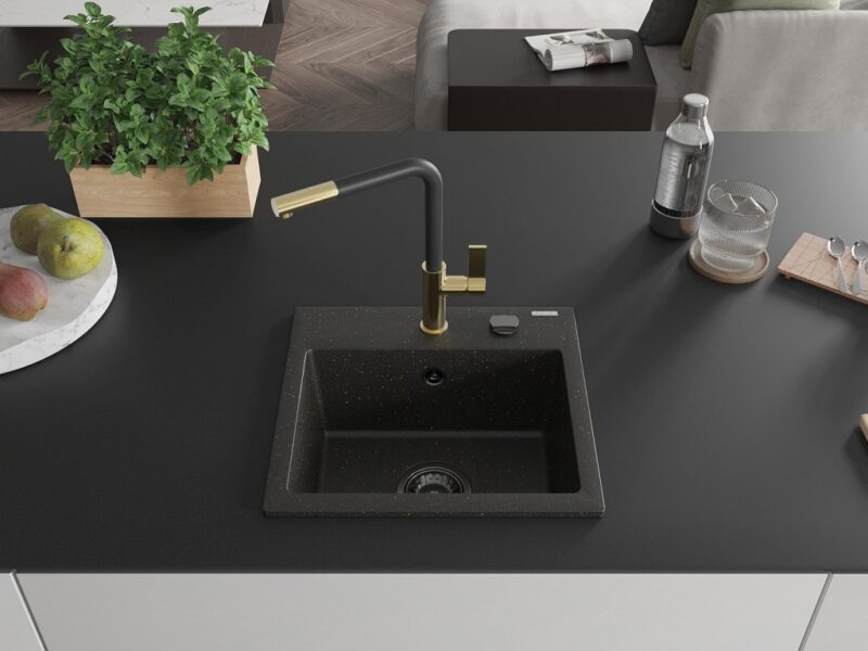 Technické dáta: drez: Rozmer: 435x410x171mm Hĺbka komory: 161 mm Rozmery komory: 375×280 mm Priemer odtoku: ø90 mm Typ: 1-komorový Typ: Zapustené do pracovnej dosky Farba: čierna / zlatá metalíza Povrchová úprava sifónu: čierna Materiál: žula (80% žulové kamenivo, 20% živice) Prepadový otvor: Áno Otvory: (batérie, automatické) 2 Vysoká odolnosť proti poškriabaniu a zmene farby Odolnosť proti tepelným šokom Ľahko čistiteľný povrch Jeden dodatočný vyfrézovaný otvor na samodierovanie ø35 kuchynská batéria: Materiál: mosadz Farba: Zlatá/Čierna Hlava: Keramická Prevzdušňovač: Áno Typ: Jedna páka Rozsah výtoku: 245 mm Výška batérie: 307 mm(GT) Ean: 5905315058270
