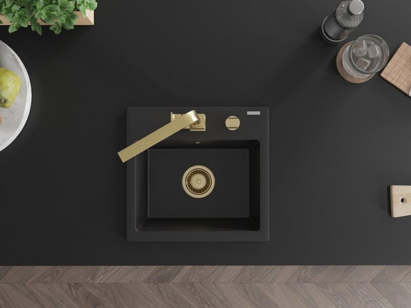 Technické dáta: drez: Rozmer: 435x410x171mm Hĺbka komory: 161 mm Rozmery komory: 375×280 mm Priemer odtoku: ø90 mm Typ: 1-komorový Typ: Zapustené do pracovnej dosky Čierna farba Povrchová úprava sifónu: zlatá Materiál: žula (80% žulové kamenivo, 20% živice) Prepadový otvor: Áno Otvory: (batérie, automatické) 2 Vysoká odolnosť proti poškriabaniu a zmene farby Odolnosť proti tepelným šokom Ľahko čistiteľný povrch Jeden dodatočný vyfrézovaný otvor na samodierovanie ø35 kuchynská batéria: Materiál: mosadz Farba: Zlatá Hlava: Keramická Prevzdušňovač: Áno Typ: Jedna páka Výška batérie: 290 mm Rozsah výtoku: 220 mm(GT) Ean: 5905315018458