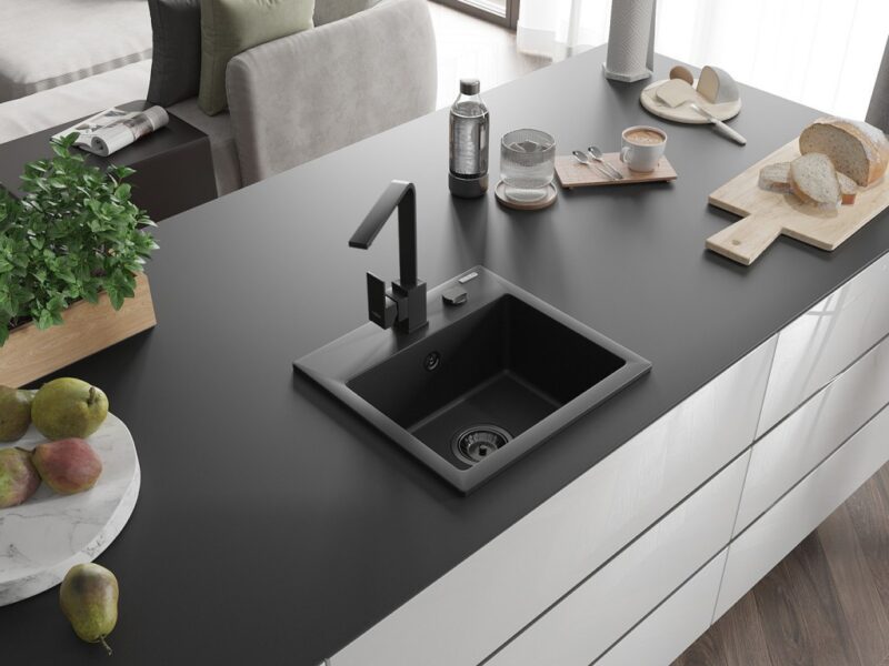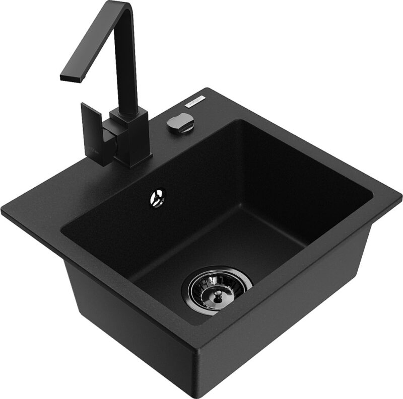 Technické dáta: drez: Rozmer: 435x410x171mm Hĺbka komory: 161 mm Rozmery komory: 375×280 mm Priemer odtoku: ø90 mm Typ: 1-komorový Typ: Zapustené do pracovnej dosky Čierna farba Povrchová úprava sifónu: čierna Materiál: žula (80% žulové kamenivo, 20% živice) Prepadový otvor: Áno Otvory: (batérie, automatické) 2 Vysoká odolnosť proti poškriabaniu a zmene farby Odolnosť proti tepelným šokom Ľahko čistiteľný povrch Jeden dodatočný vyfrézovaný otvor na samodierovanie ø35 kuchynská batéria: Materiál: mosadz Čierna farba Hlava: Keramická Prevzdušňovač: Áno Typ: Jedna páka Výška batérie: 290 mm Rozsah výtoku: 220 mm(GT) Ean: 5905315018472