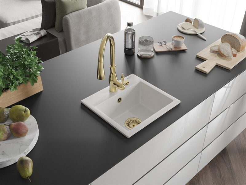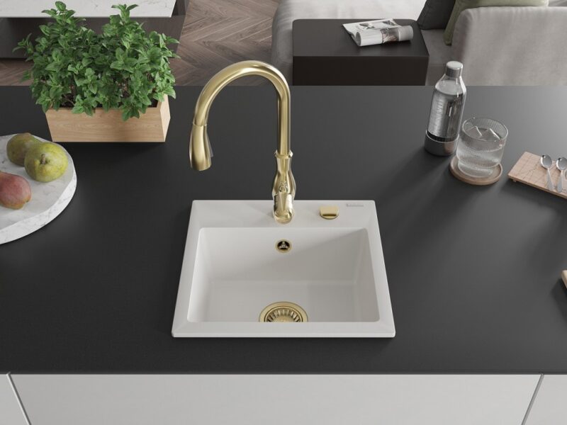 Technické dáta: drez: Rozmer: 435x410x171mm Hĺbka komory: 161 mm Rozmery komory: 375×280 mm Priemer odtoku: ø90 mm Typ: 1-komorový Typ: Zapustené do pracovnej dosky biela farba Povrchová úprava sifónu: zlatá Materiál: žula (80% žulové kamenivo, 20% živice) Prepadový otvor: Áno Otvory: (batérie, automatické) 2 Vysoká odolnosť proti poškriabaniu a zmene farby Odolnosť proti tepelným šokom Ľahko čistiteľný povrch Jeden dodatočný vyfrézovaný otvor na samodierovanie ø35 kuchynská batéria: Materiál: mosadz Farba: Zlatá Hlava: Keramická Prevzdušňovač: Áno Typ: Jedna páka Výška batérie: 410 mm Rozsah výtoku: 231 mm(GT) Ean: 5905315033550