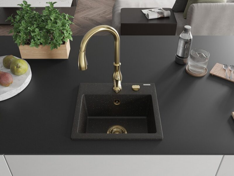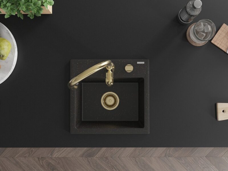 Technické dáta: drez: Rozmer: 435x410x171mm Hĺbka komory: 161 mm Rozmery komory: 375×280 mm Priemer odtoku: ø90 mm Typ: 1-komorový Typ: Zapustené do pracovnej dosky Farba: čierna / zlatá metalíza Povrchová úprava sifónu: zlatá Materiál: žula (80% žulové kamenivo, 20% živice) Prepadový otvor: Áno Otvory: (batérie, automatické) 2 Vysoká odolnosť proti poškriabaniu a zmene farby Odolnosť proti tepelným šokom Ľahko čistiteľný povrch Jeden dodatočný vyfrézovaný otvor na samodierovanie ø35 kuchynská batéria: Materiál: mosadz Farba: Zlatá Hlava: Keramická Prevzdušňovač: Áno Typ: Jedna páka Výška batérie: 410 mm Rozsah výtoku: 231 mm(GT) Ean: 5905315033710