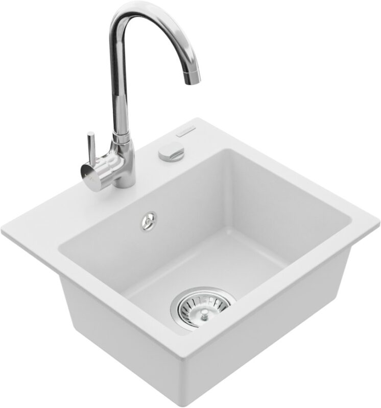 Technické dáta: drez: Rozmer: 435x410x171mm Hĺbka komory: 161 mm Rozmery komory: 375×280 mm Priemer odtoku: ø90 mm Typ: 1-komorový Typ: Zapustené do pracovnej dosky biela farba Povrchová úprava sifónu: Chrome Materiál: žula (80% žulové kamenivo, 20% živice) Prepadový otvor: Áno Otvory: (batérie, automatické) 2 Vysoká odolnosť proti poškriabaniu a zmene farby Odolnosť proti tepelným šokom Ľahko čistiteľný povrch Jeden dodatočný vyfrézovaný otvor na samodierovanie ø35 kuchynská batéria: Materiál: mosadz Farba: Chrome Hlava: Keramická Prevzdušňovač: Áno Výška batérie: 335 mm Rozsah výtoku: 180 mm(GT) Ean: 5907709189553