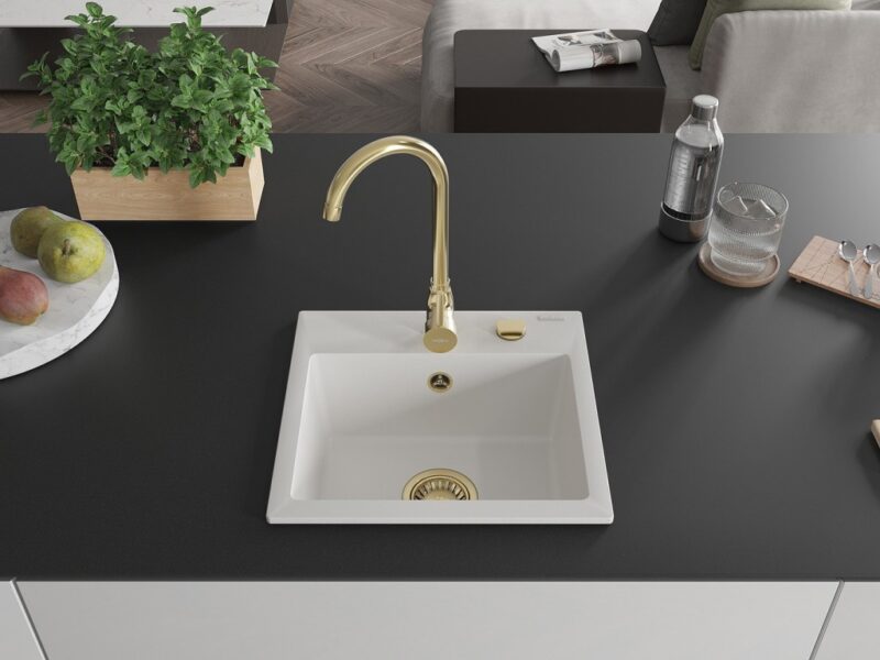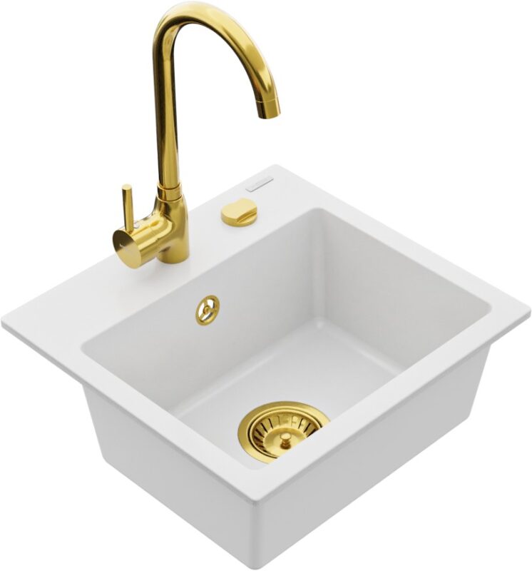 Technické dáta: drez: Rozmer: 435x410x171mm Hĺbka komory: 161 mm Rozmery komory: 375×280 mm Priemer odtoku: ø90 mm Typ: 1-komorový Typ: Zapustené do pracovnej dosky biela farba Povrchová úprava sifónu: zlatá Materiál: žula (80% žulové kamenivo, 20% živice) Prepadový otvor: Áno Otvory: (batérie, automatické) 2 Vysoká odolnosť proti poškriabaniu a zmene farby Odolnosť proti tepelným šokom Ľahko čistiteľný povrch Jeden dodatočný vyfrézovaný otvor na samodierovanie ø35 kuchynská batéria: Materiál: mosadz Farba: Zlatá Hlava: Keramická Prevzdušňovač: Áno Výška batérie: 335 mm Rozsah výtoku: 180 mm(GT) Ean: 5907709189577