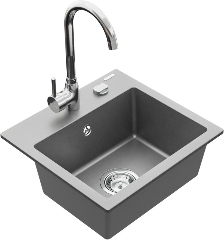 Technické dáta: drez: Rozmer: 435x410x171mm Hĺbka komory: 161 mm Rozmery komory: 375×280 mm Priemer odtoku: ø90 mm Typ: 1-komorový Typ: Zapustené do pracovnej dosky Šedá farba Povrchová úprava sifónu: Chrome Materiál: žula (80% žulové kamenivo, 20% živice) Prepadový otvor: Áno Otvory: (batérie, automatické) 2 Vysoká odolnosť proti poškriabaniu a zmene farby Odolnosť proti tepelným šokom Ľahko čistiteľný povrch Jeden dodatočný vyfrézovaný otvor na samodierovanie ø35 kuchynská batéria: Materiál: mosadz Farba: Chrome Hlava: Keramická Prevzdušňovač: Áno Výška batérie: 335 mm Rozsah výtoku: 180 mm(GT) Ean: 5907709189591