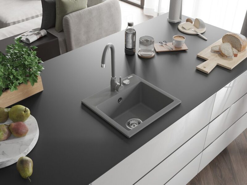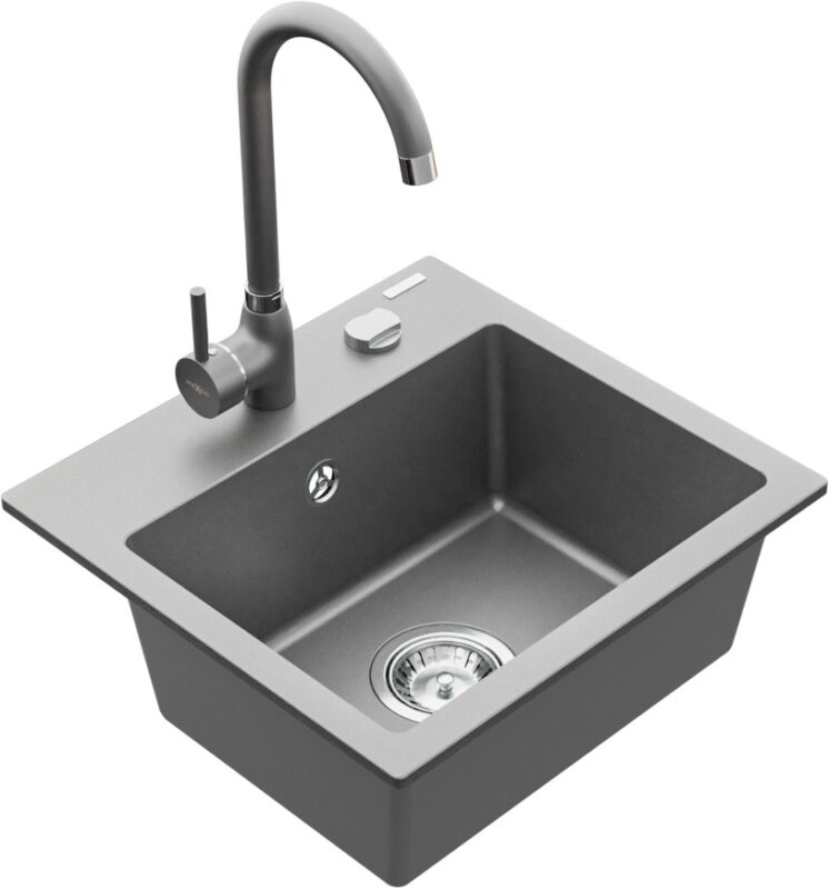 Technické dáta: drez: Rozmer: 435x410x171mm Hĺbka komory: 161 mm Rozmery komory: 375×280 mm Priemer odtoku: ø90 mm Typ: 1-komorový Typ: Zapustené do pracovnej dosky Šedá farba Povrchová úprava sifónu: Chrome Materiál: žula (80% žulové kamenivo, 20% živice) Prepadový otvor: Áno Otvory: (batérie, automatické) 2 Vysoká odolnosť proti poškriabaniu a zmene farby Odolnosť proti tepelným šokom Ľahko čistiteľný povrch Jeden dodatočný vyfrézovaný otvor na samodierovanie ø35 kuchynská batéria: Materiál: mosadz Šedá farba Hlava: Keramická Prevzdušňovač: Áno Výška batérie: 335 mm Rozsah výtoku: 180 mm(GT) Ean: 5907709189607
