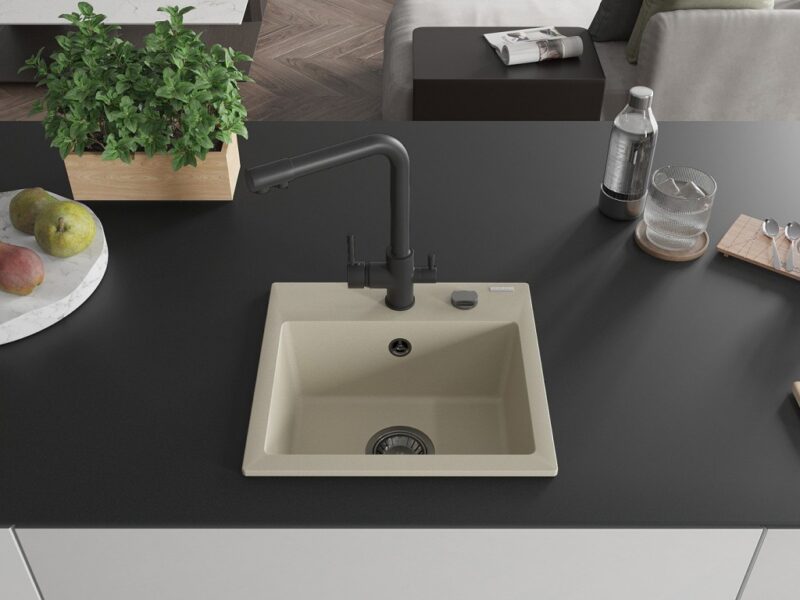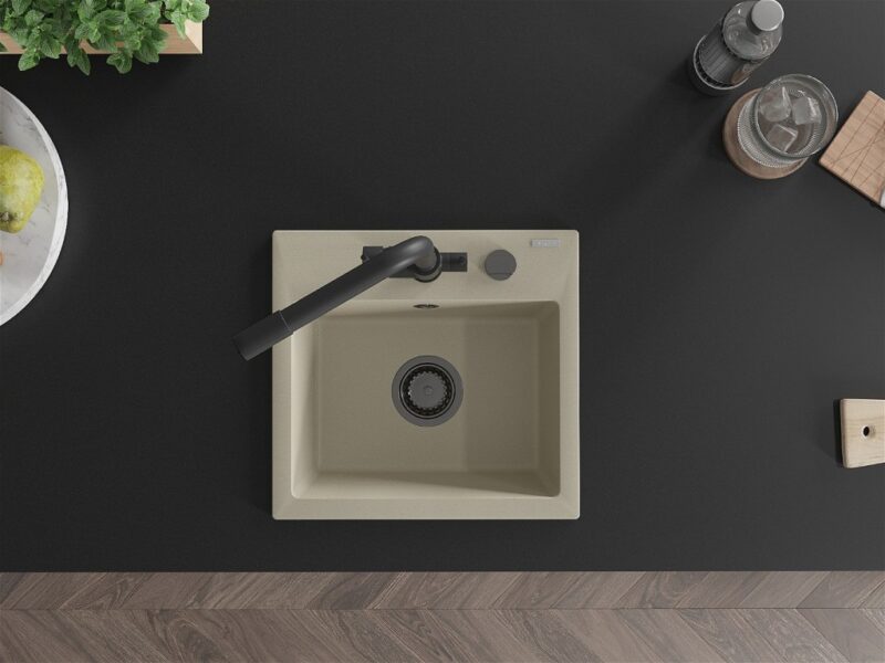 Technické dáta: drez: Rozmer: 435x410x171mm Hĺbka komory: 161 mm Rozmery komory: 375×280 mm Priemer odtoku: ø90 mm Typ: 1-komorový Typ: Zapustené do pracovnej dosky Farba béžová Povrchová úprava sifónu: čierna Materiál: žula (80% žulové kamenivo, 20% živice) Prepadový otvor: Áno Otvory: (batérie, automatické) 2 Vysoká odolnosť proti poškriabaniu a zmene farby Odolnosť proti tepelným šokom Ľahko čistiteľný povrch Jeden dodatočný vyfrézovaný otvor na samodierovanie ø35 kuchynská batéria: Materiál: mosadz Čierna farba Hlava: Keramická Prevzdušňovač: Áno Typ: Dve rukoväte Rozsah výtoku: 235 mm Výška batérie: 315 mm Dvojhlavá batéria s prídavným kanálom pre filtrovanú pitnú vodu(GT) Ean: 5905315023360