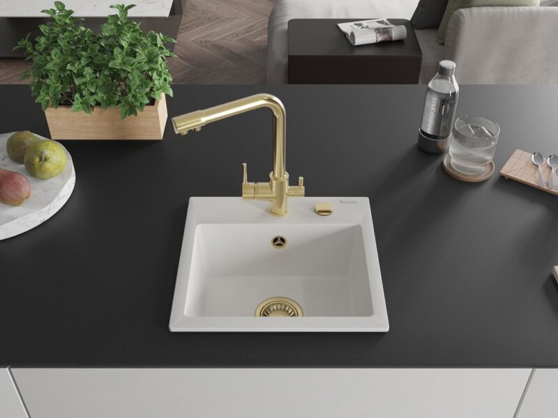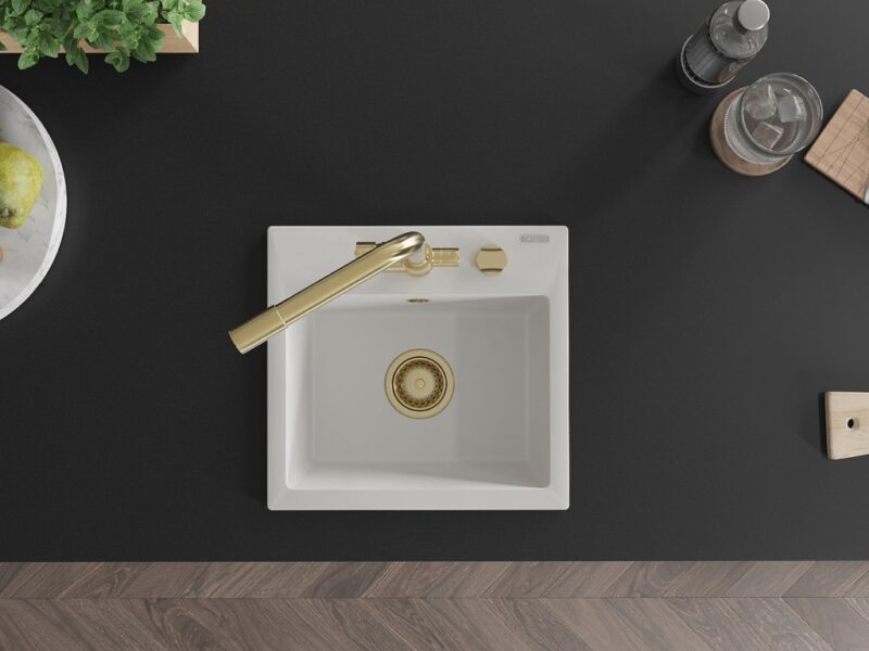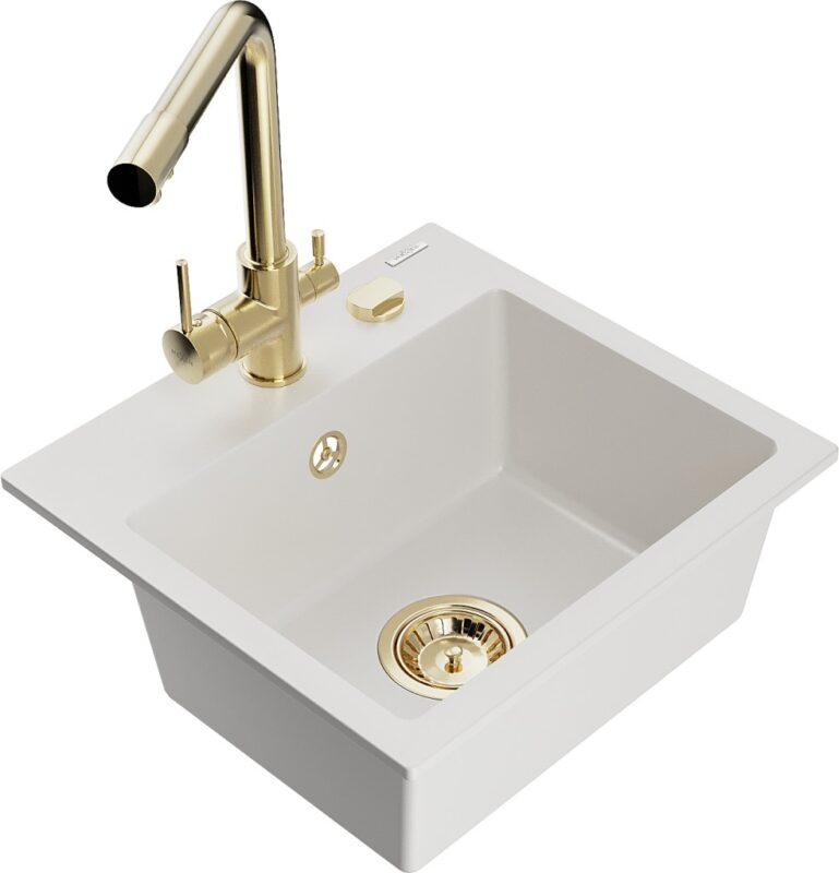Technické dáta: drez: Rozmer: 435x410x171mm Hĺbka komory: 161 mm Rozmery komory: 375×280 mm Priemer odtoku: ø90 mm Typ: 1-komorový Typ: Zapustené do pracovnej dosky biela farba Povrchová úprava sifónu: zlatá Materiál: žula (80% žulové kamenivo, 20% živice) Prepadový otvor: Áno Otvory: (batérie, automatické) 2 Vysoká odolnosť proti poškriabaniu a zmene farby Odolnosť proti tepelným šokom Ľahko čistiteľný povrch Jeden dodatočný vyfrézovaný otvor na samodierovanie ø35 kuchynská batéria: Materiál: mosadz Farba: Zlatá Hlava: Keramická Prevzdušňovač: Áno Typ: Dve rukoväte Rozsah výtoku: 235 mm Výška batérie: 315 mm Dvojhlavá batéria s prídavným kanálom pre filtrovanú pitnú vodu(GT) Ean: 5905315023315