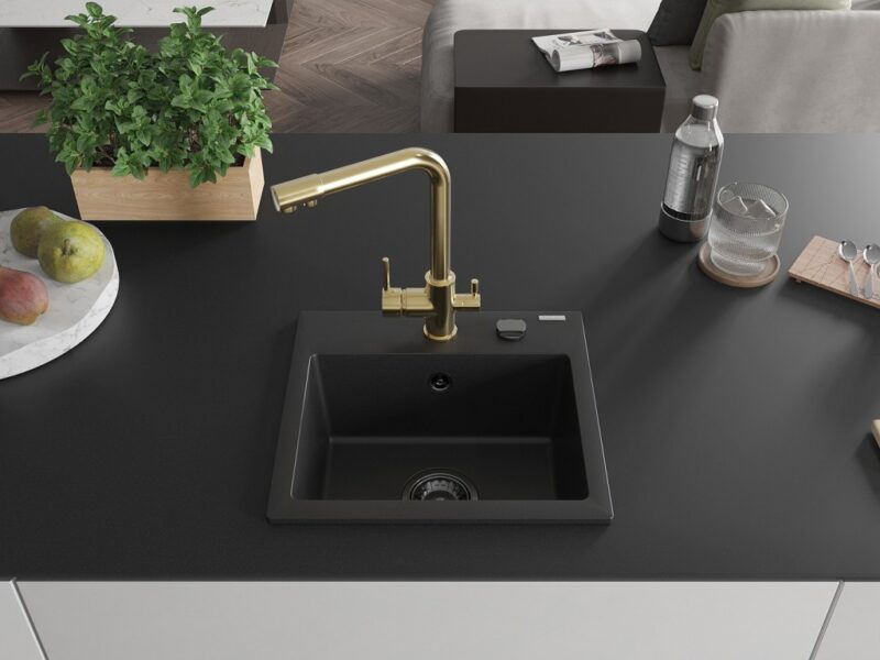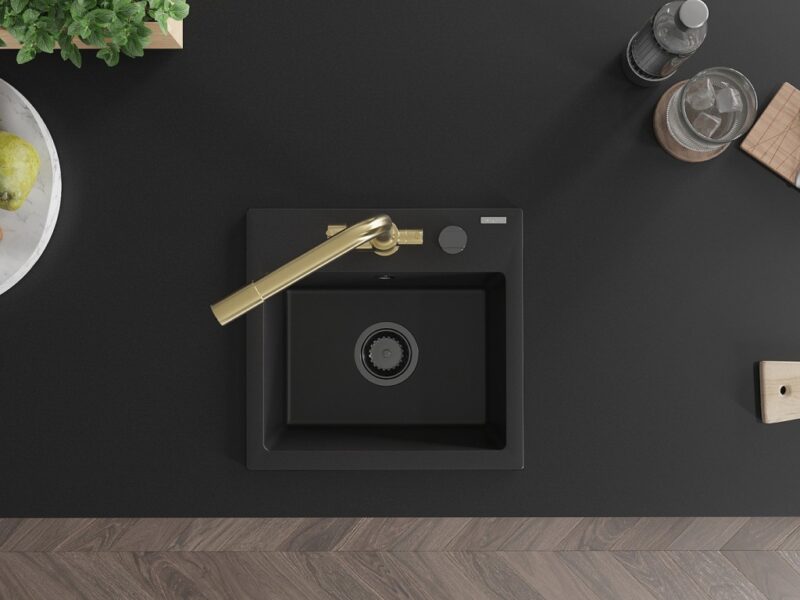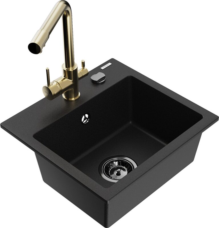 Technické dáta: drez: Rozmer: 435x410x171mm Hĺbka komory: 161 mm Rozmery komory: 375×280 mm Priemer odtoku: ø90 mm Typ: 1-komorový Typ: Zapustené do pracovnej dosky Čierna farba Povrchová úprava sifónu: čierna Materiál: žula (80% žulové kamenivo, 20% živice) Prepadový otvor: Áno Otvory: (batérie, automatické) 2 Vysoká odolnosť proti poškriabaniu a zmene farby Odolnosť proti tepelným šokom Ľahko čistiteľný povrch Jeden dodatočný vyfrézovaný otvor na samodierovanie ø35 kuchynská batéria: Materiál: mosadz Farba: Zlatá Hlava: Keramická Prevzdušňovač: Áno Typ: Dve rukoväte Rozsah výtoku: 235 mm Výška batérie: 315 mm Dvojhlavá batéria s prídavným kanálom pre filtrovanú pitnú vodu(GT) Ean: 5905315023582