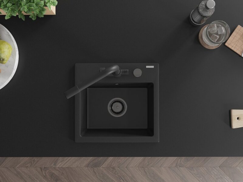 Technické dáta: drez: Rozmer: 435x410x171mm Hĺbka komory: 161 mm Rozmery komory: 375×280 mm Priemer odtoku: ø90 mm Typ: 1-komorový Typ: Zapustené do pracovnej dosky Čierna farba Povrchová úprava sifónu: čierna Materiál: žula (80% žulové kamenivo, 20% živice) Prepadový otvor: Áno Otvory: (batérie, automatické) 2 Vysoká odolnosť proti poškriabaniu a zmene farby Odolnosť proti tepelným šokom Ľahko čistiteľný povrch Jeden dodatočný vyfrézovaný otvor na samodierovanie ø35 kuchynská batéria: Materiál: mosadz Čierna farba Hlava: Keramická Prevzdušňovač: Áno Typ: Dve rukoväte Rozsah výtoku: 235 mm Výška batérie: 315 mm Dvojhlavá batéria s prídavným kanálom pre filtrovanú pitnú vodu(GT) Ean: 5905315023599