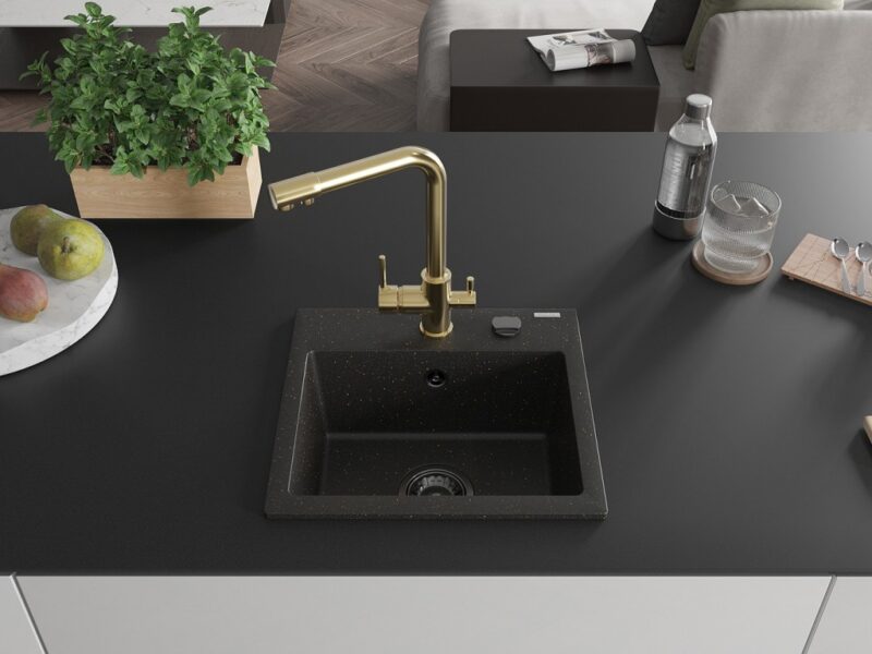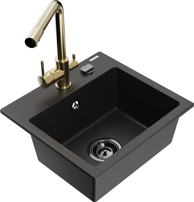 Technické dáta: drez: Rozmer: 435x410x171mm Hĺbka komory: 161 mm Rozmery komory: 375×280 mm Priemer odtoku: ø90 mm Typ: 1-komorový Typ: Zapustené do pracovnej dosky Farba: čierna / zlatá metalíza Povrchová úprava sifónu: čierna Materiál: žula (80% žulové kamenivo, 20% živice) Prepadový otvor: Áno Otvory: (batérie, automatické) 2 Vysoká odolnosť proti poškriabaniu a zmene farby Odolnosť proti tepelným šokom Ľahko čistiteľný povrch Jeden dodatočný vyfrézovaný otvor na samodierovanie ø35 kuchynská batéria: Materiál: mosadz Farba: Zlatá Hlava: Keramická Prevzdušňovač: Áno Typ: Dve rukoväte Rozsah výtoku: 235 mm Výška batérie: 315 mm Dvojhlavá batéria s prídavným kanálom pre filtrovanú pitnú vodu(GT) Ean: 5905315023483