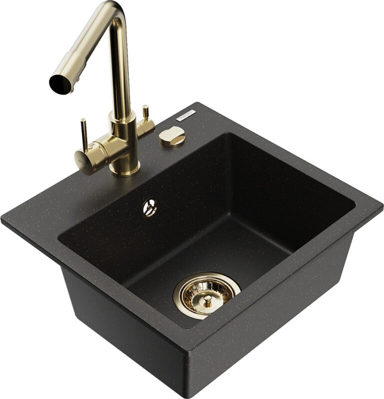 Technické dáta: drez: Rozmer: 435x410x171mm Hĺbka komory: 161 mm Rozmery komory: 375×280 mm Priemer odtoku: ø90 mm Typ: 1-komorový Typ: Zapustené do pracovnej dosky Farba: čierna / zlatá metalíza Povrchová úprava sifónu: zlatá Materiál: žula (80% žulové kamenivo, 20% živice) Prepadový otvor: Áno Otvory: (batérie, automatické) 2 Vysoká odolnosť proti poškriabaniu a zmene farby Odolnosť proti tepelným šokom Ľahko čistiteľný povrch Jeden dodatočný vyfrézovaný otvor na samodierovanie ø35 kuchynská batéria: Materiál: mosadz Farba: Zlatá Hlava: Keramická Prevzdušňovač: Áno Typ: Dve rukoväte Rozsah výtoku: 235 mm Výška batérie: 315 mm Dvojhlavá batéria s prídavným kanálom pre filtrovanú pitnú vodu(GT) Ean: 5905315023476