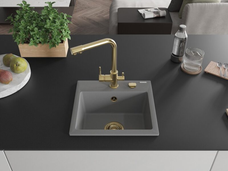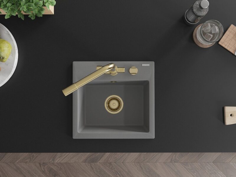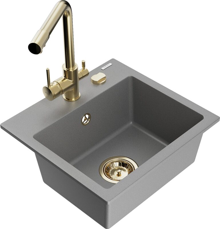 Technické dáta: drez: Rozmer: 435x410x171mm Hĺbka komory: 161 mm Rozmery komory: 375×280 mm Priemer odtoku: ø90 mm Typ: 1-komorový Typ: Zapustené do pracovnej dosky Šedá farba Povrchová úprava sifónu: zlatá Materiál: žula (80% žulové kamenivo, 20% živice) Prepadový otvor: Áno Otvory: (batérie, automatické) 2 Vysoká odolnosť proti poškriabaniu a zmene farby Odolnosť proti tepelným šokom Ľahko čistiteľný povrch Jeden dodatočný vyfrézovaný otvor na samodierovanie ø35 kuchynská batéria: Materiál: mosadz Farba: Zlatá Hlava: Keramická Prevzdušňovač: Áno Typ: Dve rukoväte Rozsah výtoku: 235 mm Výška batérie: 315 mm Dvojhlavá batéria s prídavným kanálom pre filtrovanú pitnú vodu(GT) Ean: 5905315023384