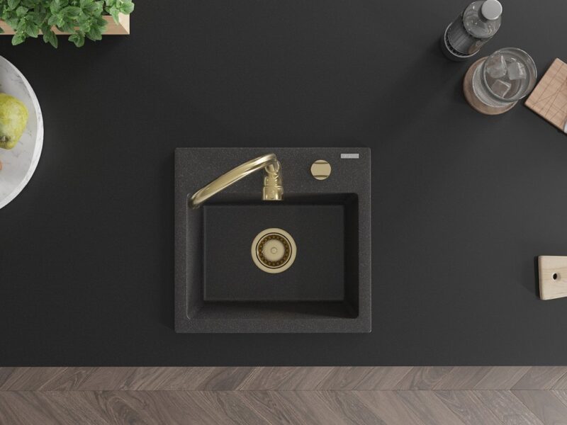 Technické dáta: drez: Rozmer: 435x410x171mm Hĺbka komory: 161 mm Rozmery komory: 375×280 mm Priemer odtoku: ø90 mm Typ: 1-komorový Typ: Zapustené do pracovnej dosky Farba: Škvrnitá čierna Povrchová úprava sifónu: zlatá Materiál: žula (80% žulové kamenivo, 20% živice) Prepadový otvor: Áno Otvory: (batérie, automatické) 2 Vysoká odolnosť proti poškriabaniu a zmene farby Odolnosť proti tepelným šokom Ľahko čistiteľný povrch Jeden dodatočný vyfrézovaný otvor na samodierovanie ø35 kuchynská batéria: Materiál: mosadz Farba: Zlatá Hlava: Keramická Prevzdušňovač: Áno Typ: Jedna páka Výška batérie: 335 mm Rozsah výtoku: 180 mm(GT) Ean: 5905315014528