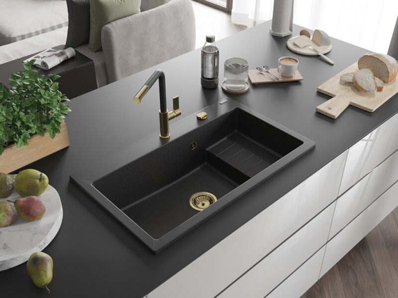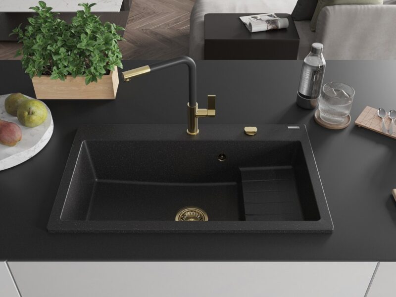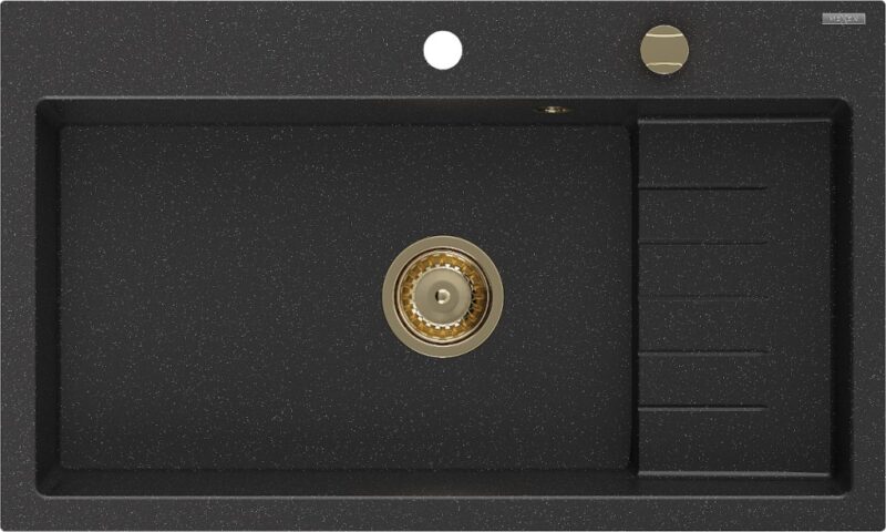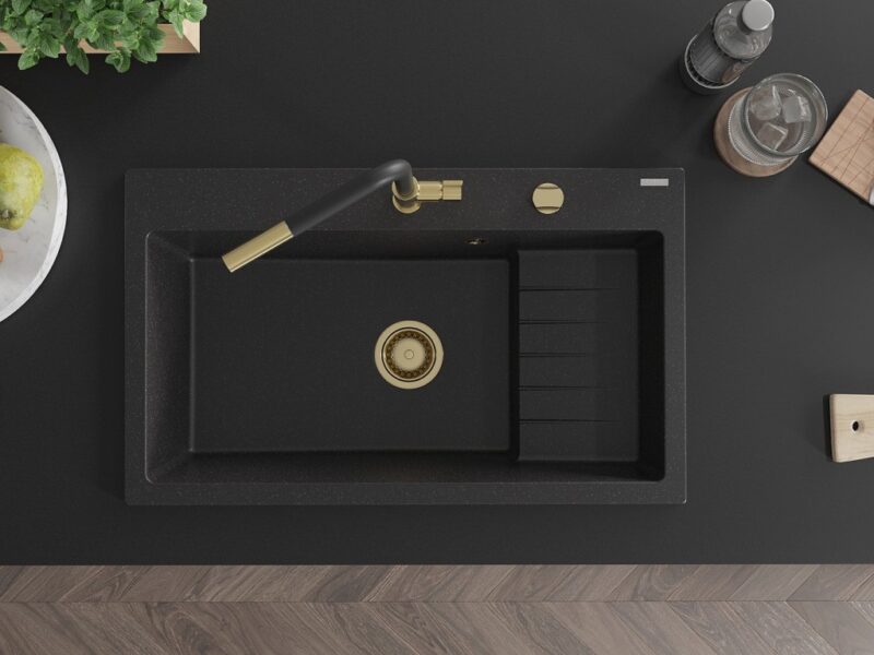 MEXEN/S MEXEN/S – Omar granitový drez 800 x 480 mm, čierna/strieborná metalík, zlatý sifón 6520801005-73-G