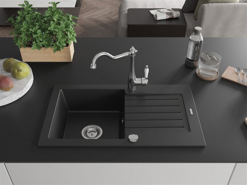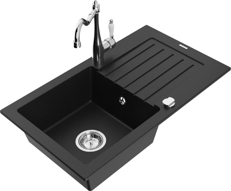 Technické dáta: drez: Rozmer: 752 x 436 x 161 mm Hĺbka komory: 151 mm Rozmery komory: 356×332 mm Priemer odtoku: ø90 mm Typ: 1-miska s odkvapkávačom Typ: Zapustené do pracovnej dosky Čierna farba Povrchová úprava sifónu: Chrome Materiál: žula (80% žulové kamenivo, 20% živice) Prepadový otvor: Áno Otvory: (batérie, automatické) 2 Inštalácia: Univerzálna, je možné inštalovať s odkvapkávačom na ľavú alebo pravú stranu Vysoká odolnosť proti poškriabaniu a zmene farby Odolnosť proti tepelným šokom Ľahko čistiteľný povrch Dva dodatočné vyfrézované otvory na samodierovanie ø35 kuchynská batéria: Materiál: mosadz Farba: Chrome Hlava: Keramická Prevzdušňovač: Áno Typ: Jedna páka Výška batérie: 290 mm Rozsah výtoku: 260 mm(GT) Ean: 5905315039897