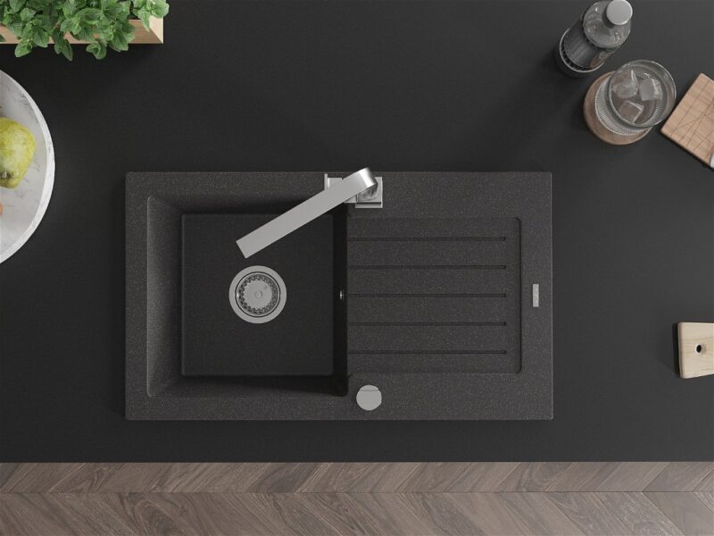 Technické dáta: drez: Rozmer: 752 x 436 x 161 mm Hĺbka komory: 151 mm Rozmery komory: 356×332 mm Priemer odtoku: ø90 mm Typ: 1-miska s odkvapkávačom Typ: Zapustené do pracovnej dosky Farba: Škvrnitá čierna Povrchová úprava sifónu: Chrome Materiál: žula (80% žulové kamenivo, 20% živice) Prepadový otvor: Áno Otvory: (batérie, automatické) 2 Inštalácia: Univerzálna, je možné inštalovať s odkvapkávačom na ľavú alebo pravú stranu Vysoká odolnosť proti poškriabaniu a zmene farby Odolnosť proti tepelným šokom Ľahko čistiteľný povrch Dva dodatočné vyfrézované otvory na samodierovanie ø35 kuchynská batéria: Materiál: mosadz Farba: Chrome Hlava: Keramická Prevzdušňovač: Áno Typ: Jedna páka Výška batérie: 290 mm Rozsah výtoku: 220 mm(GT) Ean: 5905315019356
