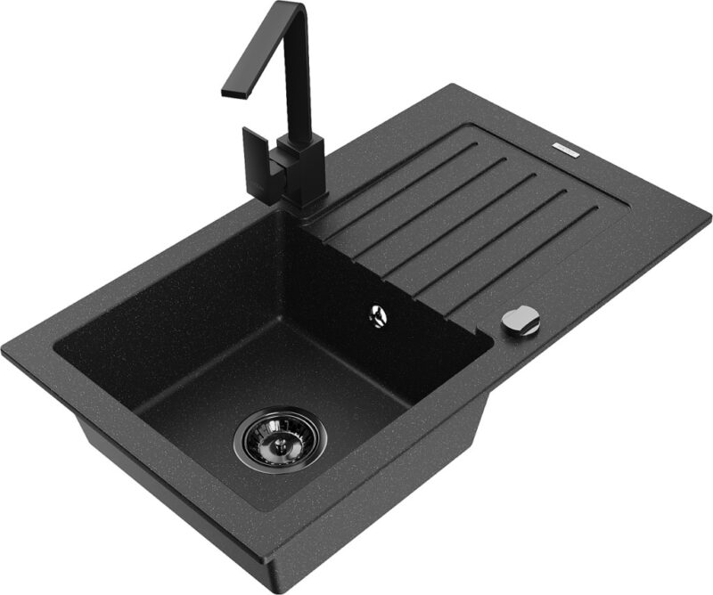 Technické dáta: drez: Rozmer: 752 x 436 x 161 mm Hĺbka komory: 151 mm Rozmery komory: 356×332 mm Priemer odtoku: ø90 mm Typ: 1-miska s odkvapkávačom Typ: Zapustené do pracovnej dosky Farba: čierna/strieborná metalíza Povrchová úprava sifónu: čierna Materiál: žula (80% žulové kamenivo, 20% živice) Prepadový otvor: Áno Otvory: (batérie, automatické) 2 Inštalácia: Univerzálna, je možné inštalovať s odkvapkávačom na ľavú alebo pravú stranu Vysoká odolnosť proti poškriabaniu a zmene farby Odolnosť proti tepelným šokom Ľahko čistiteľný povrch Dva dodatočné vyfrézované otvory na samodierovanie ø35 kuchynská batéria: Materiál: mosadz Čierna farba Hlava: Keramická Prevzdušňovač: Áno Typ: Jedna páka Výška batérie: 290 mm Rozsah výtoku: 220 mm(GT) Ean: 5905315019295