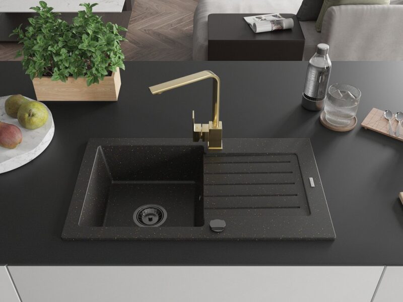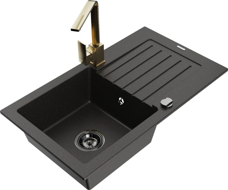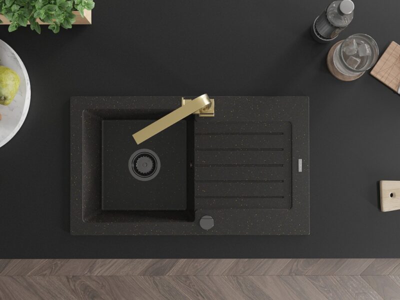 MEXEN/S MEXEN/S – Pablo granitový drez 1-miska s odkvapkávačom vrátane batérie Rita, čierny/zlatý metali 6510-75-670300-50-B