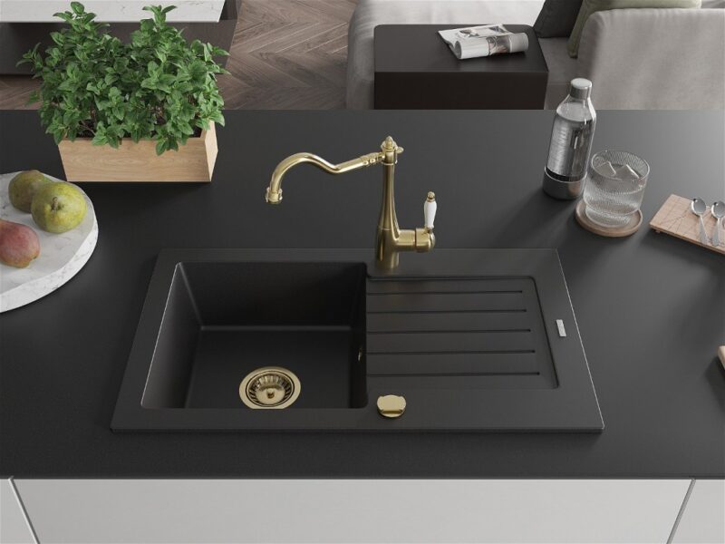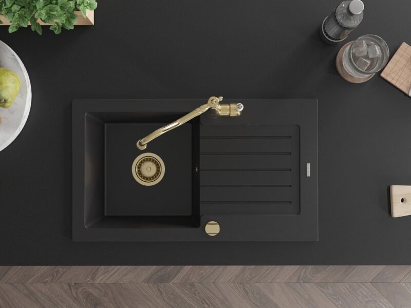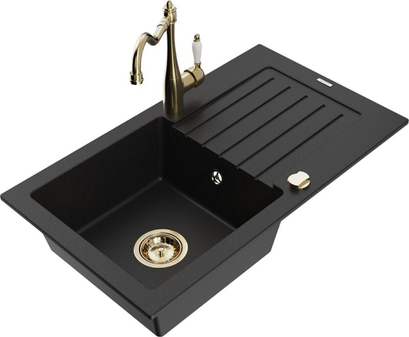 Technické dáta: drez: Rozmer: 752 x 436 x 161 mm Hĺbka komory: 151 mm Rozmery komory: 356×332 mm Priemer odtoku: ø90 mm Typ: 1-miska s odkvapkávačom Typ: Zapustené do pracovnej dosky Čierna farba Povrchová úprava sifónu: zlatá Materiál: žula (80% žulové kamenivo, 20% živice) Prepadový otvor: Áno Otvory: (batérie, automatické) 2 Inštalácia: Univerzálna, je možné inštalovať s odkvapkávačom na ľavú alebo pravú stranu Vysoká odolnosť proti poškriabaniu a zmene farby Odolnosť proti tepelným šokom Ľahko čistiteľný povrch Dva dodatočné vyfrézované otvory na samodierovanie ø35 kuchynská batéria: Materiál: mosadz Farba: Zlatá Hlava: Keramická Prevzdušňovač: Áno Typ: Jedna páka Výška batérie: 290 mm Rozsah výtoku: 260 mm(GT) Ean: 5905315039903