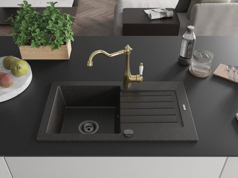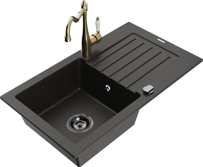 Technické dáta: drez: Rozmer: 752 x 436 x 161 mm Hĺbka komory: 151 mm Rozmery komory: 356×332 mm Priemer odtoku: ø90 mm Typ: 1-miska s odkvapkávačom Typ: Zapustené do pracovnej dosky Farba: čierna / zlatá metalíza Povrchová úprava sifónu: čierna Materiál: žula (80% žulové kamenivo, 20% živice) Prepadový otvor: Áno Otvory: (batérie, automatické) 2 Inštalácia: Univerzálna, je možné inštalovať s odkvapkávačom na ľavú alebo pravú stranu Vysoká odolnosť proti poškriabaniu a zmene farby Odolnosť proti tepelným šokom Ľahko čistiteľný povrch Dva dodatočné vyfrézované otvory na samodierovanie ø35 kuchynská batéria: Materiál: mosadz Farba: Zlatá Hlava: Keramická Prevzdušňovač: Áno Typ: Jedna páka Výška batérie: 290 mm Rozsah výtoku: 260 mm(GT) Ean: 5905315039811