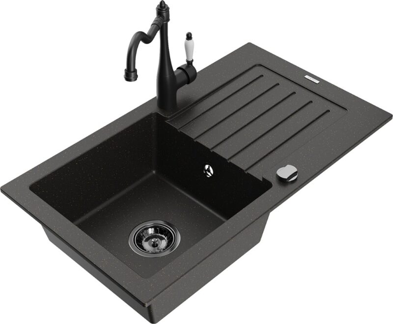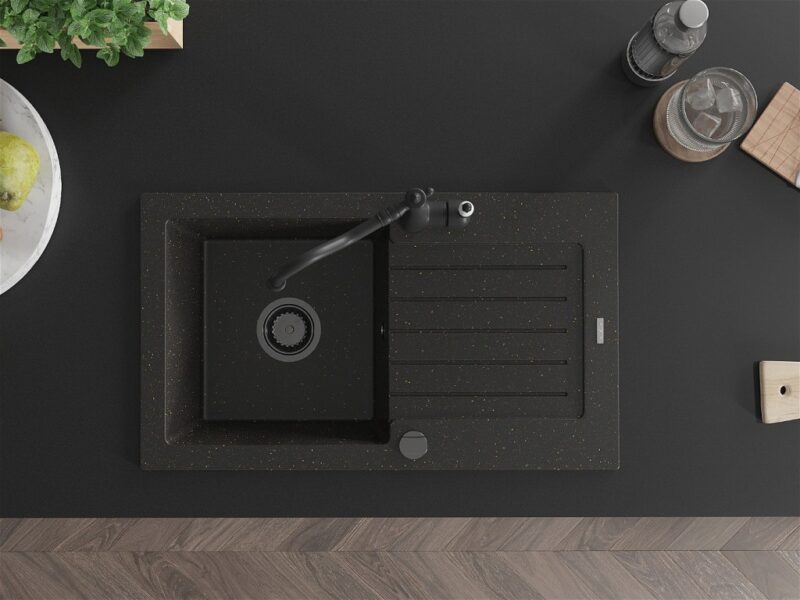 Technické dáta: drez: Rozmer: 752 x 436 x 161 mm Hĺbka komory: 151 mm Rozmery komory: 356×332 mm Priemer odtoku: ø90 mm Typ: 1-miska s odkvapkávačom Typ: Zapustené do pracovnej dosky Farba: čierna / zlatá metalíza Povrchová úprava sifónu: čierna Materiál: žula (80% žulové kamenivo, 20% živice) Prepadový otvor: Áno Otvory: (batérie, automatické) 2 Inštalácia: Univerzálna, je možné inštalovať s odkvapkávačom na ľavú alebo pravú stranu Vysoká odolnosť proti poškriabaniu a zmene farby Odolnosť proti tepelným šokom Ľahko čistiteľný povrch Dva dodatočné vyfrézované otvory na samodierovanie ø35 kuchynská batéria: Materiál: mosadz Čierna farba Hlava: Keramická Prevzdušňovač: Áno Typ: Jedna páka Výška batérie: 290 mm Rozsah výtoku: 260 mm(GT) Ean: 5905315039828