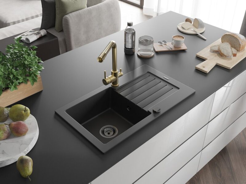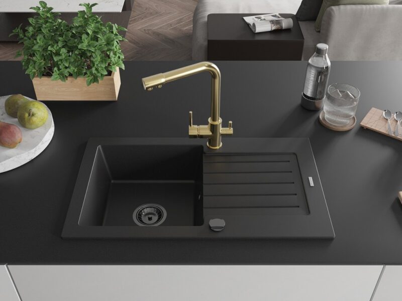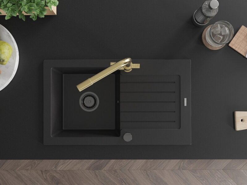 Technické dáta: drez: Rozmer: 752 x 436 x 161 mm Hĺbka komory: 151 mm Rozmery komory: 356×332 mm Priemer odtoku: ø90 mm Typ: 1-miska s odkvapkávačom Typ: Zapustené do pracovnej dosky Čierna farba Povrchová úprava sifónu: čierna Materiál: žula (80% žulové kamenivo, 20% živice) Prepadový otvor: Áno Otvory: (batérie, automatické) 2 Inštalácia: Univerzálna, je možné inštalovať s odkvapkávačom na ľavú alebo pravú stranu Vysoká odolnosť proti poškriabaniu a zmene farby Odolnosť proti tepelným šokom Ľahko čistiteľný povrch Dva dodatočné vyfrézované otvory na samodierovanie ø35 kuchynská batéria: Materiál: mosadz Farba: Zlatá Hlava: Keramická Prevzdušňovač: Áno Typ: Dve rukoväte Rozsah výtoku: 235 mm Výška batérie: 315 mm Dvojhlavá batéria s prídavným kanálom pre filtrovanú pitnú vodu(GT) Ean: 5905315024541