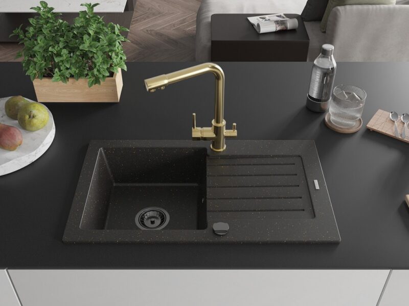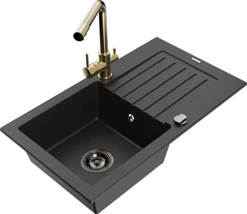 Technické dáta: drez: Rozmer: 752 x 436 x 161 mm Hĺbka komory: 151 mm Rozmery komory: 356×332 mm Priemer odtoku: ø90 mm Typ: 1-miska s odkvapkávačom Typ: Zapustené do pracovnej dosky Farba: čierna / zlatá metalíza Povrchová úprava sifónu: čierna Materiál: žula (80% žulové kamenivo, 20% živice) Prepadový otvor: Áno Otvory: (batérie, automatické) 2 Inštalácia: Univerzálna, je možné inštalovať s odkvapkávačom na ľavú alebo pravú stranu Vysoká odolnosť proti poškriabaniu a zmene farby Odolnosť proti tepelným šokom Ľahko čistiteľný povrch Dva dodatočné vyfrézované otvory na samodierovanie ø35 kuchynská batéria: Materiál: mosadz Farba: Zlatá Hlava: Keramická Prevzdušňovač: Áno Typ: Dve rukoväte Rozsah výtoku: 235 mm Výška batérie: 315 mm Dvojhlavá batéria s prídavným kanálom pre filtrovanú pitnú vodu(GT) Ean: 5905315024442