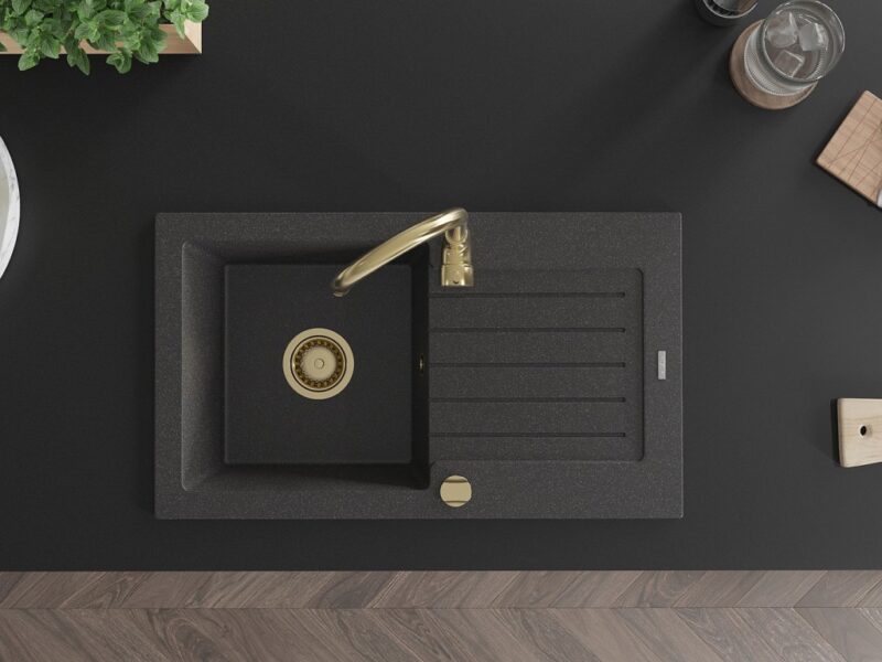 MEXEN/S MEXEN/S – Pablo granitový drez 1 s odkvapkávačom 752 x 436 mm, čierna kropenatá, + zlatý sifón 6510751010-76-G