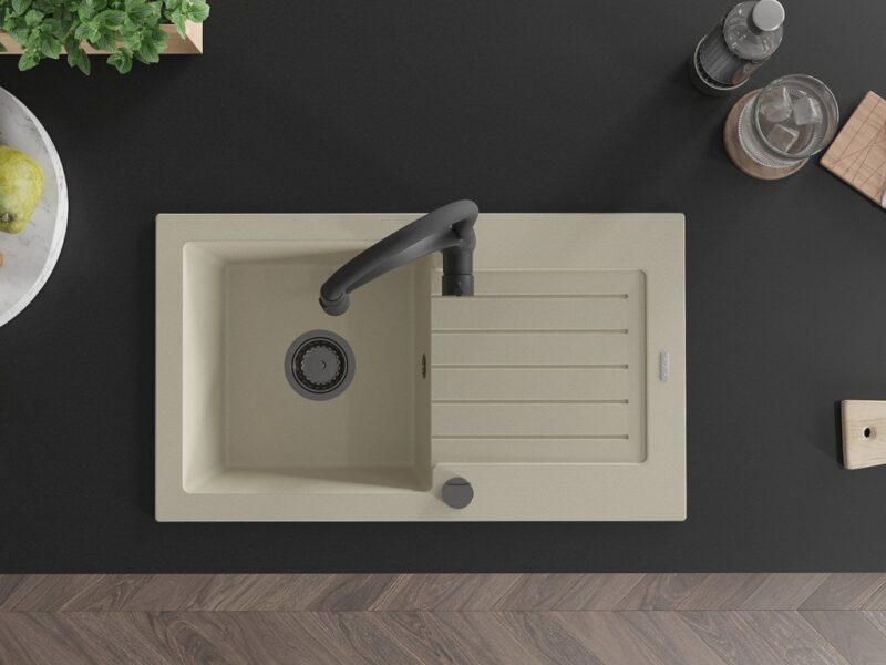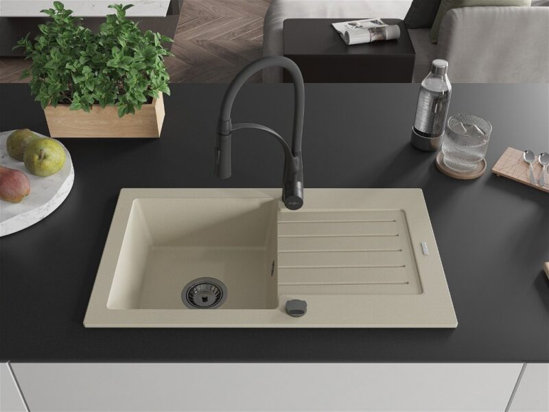 Technické dáta: drez: Rozmer: 752 x 436 x 161 mm Hĺbka komory: 151 mm Rozmery komory: 356×332 mm Priemer odtoku: ø90 mm Typ: 1-miska s odkvapkávačom Typ: Zapustené do pracovnej dosky Farba béžová Povrchová úprava sifónu: čierna Materiál: žula (80% žulové kamenivo, 20% živice) Prepadový otvor: Áno Otvory: (batérie, automatické) 2 Inštalácia: Univerzálna, je možné inštalovať s odkvapkávačom na ľavú alebo pravú stranu Vysoká odolnosť proti poškriabaniu a zmene farby Odolnosť proti tepelným šokom Ľahko čistiteľný povrch Dva dodatočné vyfrézované otvory na samodierovanie ø35 kuchynská batéria: Materiál: mosadz Čierna farba Hlava: Keramická Prevzdušňovač: Áno Typ: Jedna páka Výška batérie: 430 mm Rozsah výtoku: 185 mm Batéria má výsuvný výtok(GT) Ean: 5905315045560