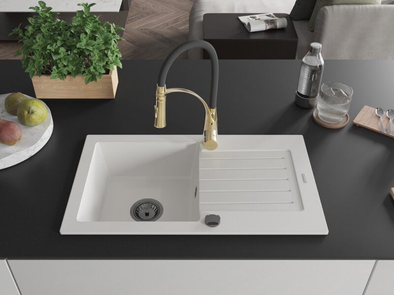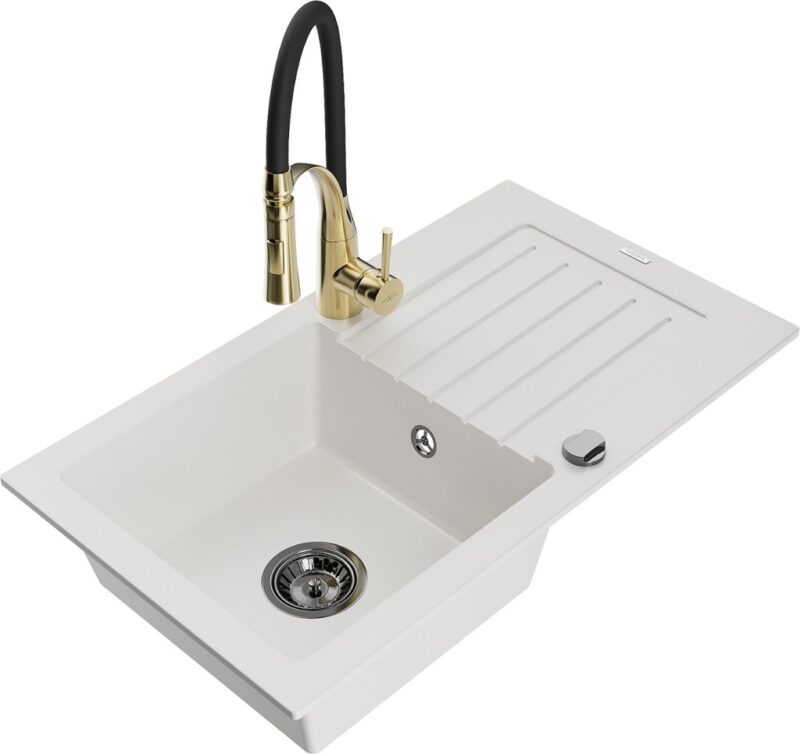 Technické dáta: drez: Rozmer: 752 x 436 x 161 mm Hĺbka komory: 151 mm Rozmery komory: 356×332 mm Priemer odtoku: ø90 mm Typ: 1-miska s odkvapkávačom Typ: Zapustené do pracovnej dosky biela farba Povrchová úprava sifónu: čierna Materiál: žula (80% žulové kamenivo, 20% živice) Prepadový otvor: Áno Otvory: (batérie, automatické) 2 Inštalácia: Univerzálna, je možné inštalovať s odkvapkávačom na ľavú alebo pravú stranu Vysoká odolnosť proti poškriabaniu a zmene farby Odolnosť proti tepelným šokom Ľahko čistiteľný povrch Dva dodatočné vyfrézované otvory na samodierovanie ø35 kuchynská batéria: Materiál: mosadz Farba: Zlatá/Čierna Hlava: Keramická Prevzdušňovač: Áno Typ: Jedna páka Výška batérie: 430 mm Rozsah výtoku: 185 mm Batéria má výsuvný výtok(GT) Ean: 5905315045492