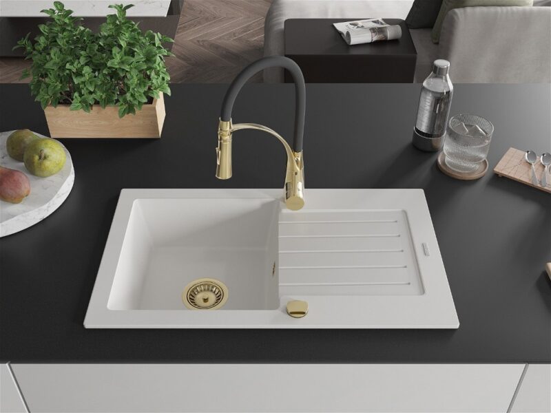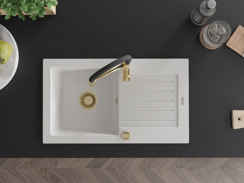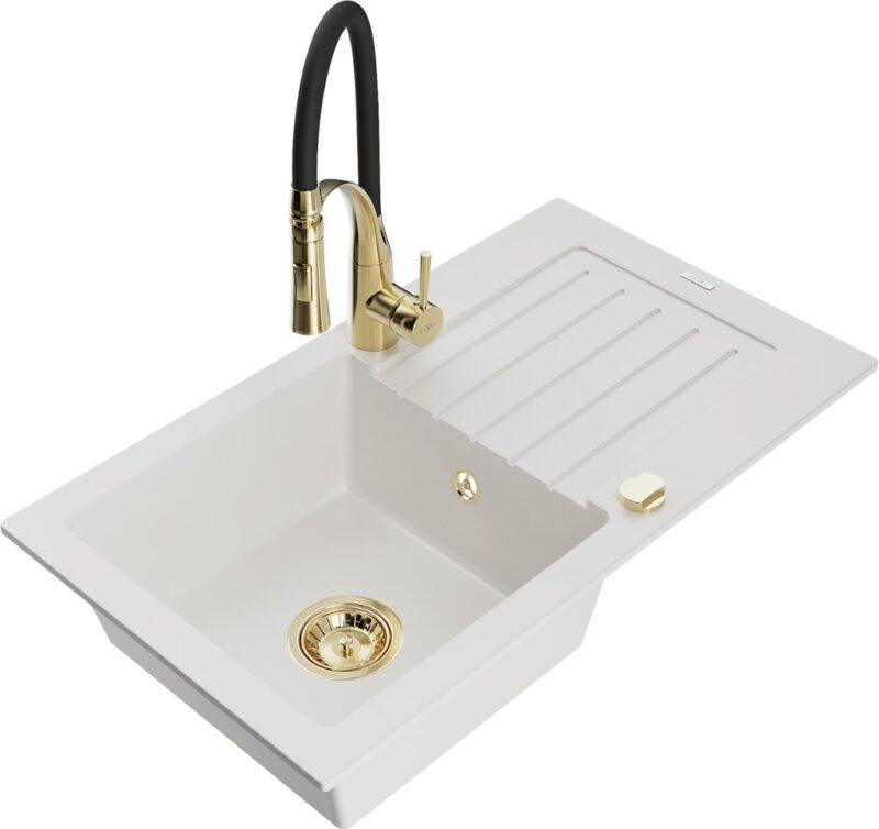 Technické dáta: drez: Rozmer: 752 x 436 x 161 mm Hĺbka komory: 151 mm Rozmery komory: 356×332 mm Priemer odtoku: ø90 mm Typ: 1-miska s odkvapkávačom Typ: Zapustené do pracovnej dosky biela farba Povrchová úprava sifónu: zlatá Materiál: žula (80% žulové kamenivo, 20% živice) Prepadový otvor: Áno Otvory: (batérie, automatické) 2 Inštalácia: Univerzálna, je možné inštalovať s odkvapkávačom na ľavú alebo pravú stranu Vysoká odolnosť proti poškriabaniu a zmene farby Odolnosť proti tepelným šokom Ľahko čistiteľný povrch Dva dodatočné vyfrézované otvory na samodierovanie ø35 kuchynská batéria: Materiál: mosadz Farba: Zlatá/Čierna Hlava: Keramická Prevzdušňovač: Áno Typ: Jedna páka Výška batérie: 430 mm Rozsah výtoku: 185 mm Batéria má výsuvný výtok(GT) Ean: 5905315045485