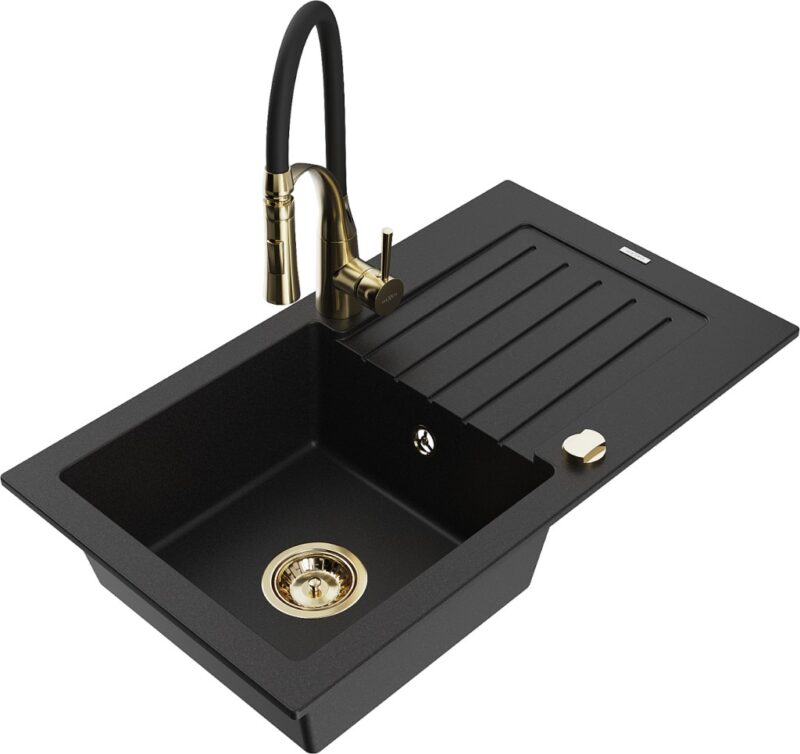 Technické dáta: drez: Rozmer: 752 x 436 x 161 mm Hĺbka komory: 151 mm Rozmery komory: 356×332 mm Priemer odtoku: ø90 mm Typ: 1-miska s odkvapkávačom Typ: Zapustené do pracovnej dosky Čierna farba Povrchová úprava sifónu: zlatá Materiál: žula (80% žulové kamenivo, 20% živice) Prepadový otvor: Áno Otvory: (batérie, automatické) 2 Inštalácia: Univerzálna, je možné inštalovať s odkvapkávačom na ľavú alebo pravú stranu Vysoká odolnosť proti poškriabaniu a zmene farby Odolnosť proti tepelným šokom Ľahko čistiteľný povrch Dva dodatočné vyfrézované otvory na samodierovanie ø35 kuchynská batéria: Materiál: mosadz Farba: Zlatá/Čierna Hlava: Keramická Prevzdušňovač: Áno Typ: Jedna páka Výška batérie: 430 mm Rozsah výtoku: 185 mm Batéria má výsuvný výtok(GT) Ean: 5905315045843