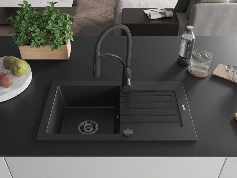 Technické dáta: drez: Rozmer: 752 x 436 x 161 mm Hĺbka komory: 151 mm Rozmery komory: 356×332 mm Priemer odtoku: ø90 mm Typ: 1-miska s odkvapkávačom Typ: Zapustené do pracovnej dosky Čierna farba Povrchová úprava sifónu: čierna Materiál: žula (80% žulové kamenivo, 20% živice) Prepadový otvor: Áno Otvory: (batérie, automatické) 2 Inštalácia: Univerzálna, je možné inštalovať s odkvapkávačom na ľavú alebo pravú stranu Vysoká odolnosť proti poškriabaniu a zmene farby Odolnosť proti tepelným šokom Ľahko čistiteľný povrch Dva dodatočné vyfrézované otvory na samodierovanie ø35 kuchynská batéria: Materiál: mosadz Čierna farba Hlava: Keramická Prevzdušňovač: Áno Typ: Jedna páka Výška batérie: 430 mm Rozsah výtoku: 185 mm Batéria má výsuvný výtok(GT) Ean: 5905315045867