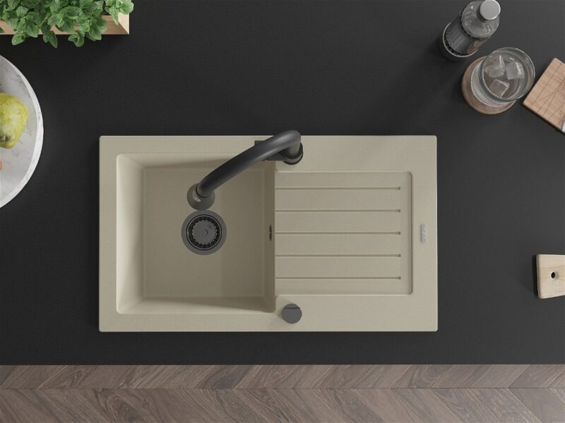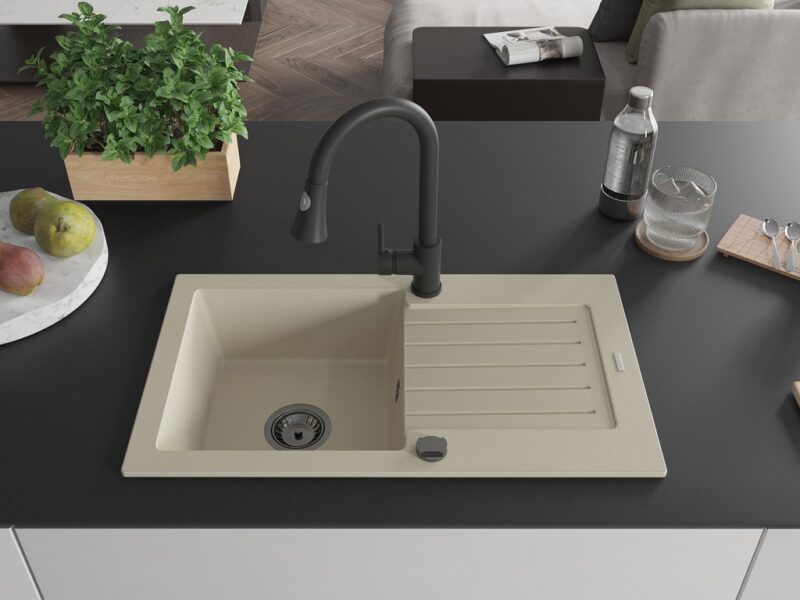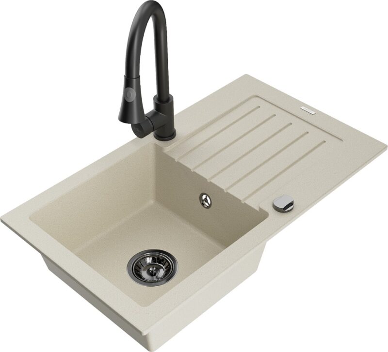 Technické dáta: drez: Rozmer: 752 x 436 x 161 mm Hĺbka komory: 151 mm Rozmery komory: 356×332 mm Priemer odtoku: ø90 mm Typ: 1-miska s odkvapkávačom Typ: Zapustené do pracovnej dosky Farba béžová Povrchová úprava sifónu: čierna Materiál: žula (80% žulové kamenivo, 20% živice) Prepadový otvor: Áno Otvory: (batérie, automatické) 2 Inštalácia: Univerzálna, je možné inštalovať s odkvapkávačom na ľavú alebo pravú stranu Vysoká odolnosť proti poškriabaniu a zmene farby Odolnosť proti tepelným šokom Ľahko čistiteľný povrch Dva dodatočné vyfrézované otvory na samodierovanie ø35 kuchynská batéria: Materiál: mosadz Čierna farba Hlava: Keramická Prevzdušňovač: Áno Typ: Jedna páka Výška batérie: 380 mm Rozsah výtoku: 252 mm Typ výtoku: Výsuvný(GT) Ean: 5905315029447
