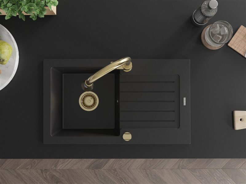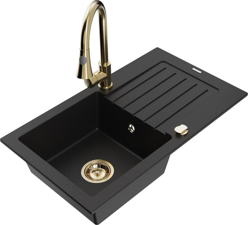 Technické dáta: drez: Rozmer: 752 x 436 x 161 mm Hĺbka komory: 151 mm Rozmery komory: 356×332 mm Priemer odtoku: ø90 mm Typ: 1-miska s odkvapkávačom Typ: Zapustené do pracovnej dosky Čierna farba Povrchová úprava sifónu: zlatá Materiál: žula (80% žulové kamenivo, 20% živice) Prepadový otvor: Áno Otvory: (batérie, automatické) 2 Inštalácia: Univerzálna, je možné inštalovať s odkvapkávačom na ľavú alebo pravú stranu Vysoká odolnosť proti poškriabaniu a zmene farby Odolnosť proti tepelným šokom Ľahko čistiteľný povrch Dva dodatočné vyfrézované otvory na samodierovanie ø35 kuchynská batéria: Materiál: mosadz Farba: Zlatá Hlava: Keramická Prevzdušňovač: Áno Typ: Jedna páka Výška batérie: 380 mm Rozsah výtoku: 252 mm Typ výtoku: Výsuvný(GT) Ean: 5905315029652