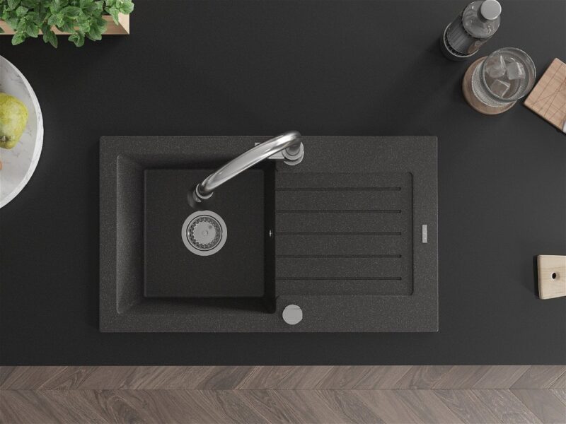 Technické dáta: drez: Rozmer: 752 x 436 x 161 mm Hĺbka komory: 151 mm Rozmery komory: 356×332 mm Priemer odtoku: ø90 mm Typ: 1-miska s odkvapkávačom Typ: Zapustené do pracovnej dosky Farba: Škvrnitá čierna Povrchová úprava sifónu: Chrome Materiál: žula (80% žulové kamenivo, 20% živice) Prepadový otvor: Áno Otvory: (batérie, automatické) 2 Inštalácia: Univerzálna, je možné inštalovať s odkvapkávačom na ľavú alebo pravú stranu Vysoká odolnosť proti poškriabaniu a zmene farby Odolnosť proti tepelným šokom Ľahko čistiteľný povrch Dva dodatočné vyfrézované otvory na samodierovanie ø35 kuchynská batéria: Materiál: mosadz Farba: Chrome Hlava: Keramická Prevzdušňovač: Áno Typ: Jedna páka Výška batérie: 380 mm Rozsah výtoku: 252 mm Typ výtoku: Výsuvný(GT) Ean: 5905315029591