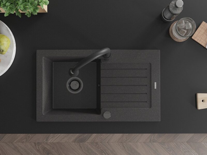 Technické dáta: drez: Rozmer: 752 x 436 x 161 mm Hĺbka komory: 151 mm Rozmery komory: 356×332 mm Priemer odtoku: ø90 mm Typ: 1-miska s odkvapkávačom Typ: Zapustené do pracovnej dosky Farba: Škvrnitá čierna Povrchová úprava sifónu: čierna Materiál: žula (80% žulové kamenivo, 20% živice) Prepadový otvor: Áno Otvory: (batérie, automatické) 2 Inštalácia: Univerzálna, je možné inštalovať s odkvapkávačom na ľavú alebo pravú stranu Vysoká odolnosť proti poškriabaniu a zmene farby Odolnosť proti tepelným šokom Ľahko čistiteľný povrch Dva dodatočné vyfrézované otvory na samodierovanie ø35 kuchynská batéria: Materiál: mosadz Čierna farba Hlava: Keramická Prevzdušňovač: Áno Typ: Jedna páka Výška batérie: 380 mm Rozsah výtoku: 252 mm Typ výtoku: Výsuvný(GT) Ean: 5905315029621