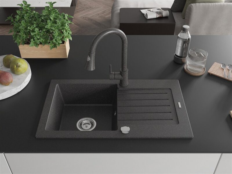 MEXEN/S MEXEN/S – Pablo granitový drez 1 s odkvapkávačom vrátane batérie Elia, čierna kropenatá 6510-76-670101-76