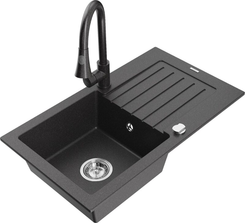 Technické dáta: drez: Rozmer: 752 x 436 x 161 mm Hĺbka komory: 151 mm Rozmery komory: 356×332 mm Priemer odtoku: ø90 mm Typ: 1-miska s odkvapkávačom Typ: Zapustené do pracovnej dosky Farba: Škvrnitá čierna Povrchová úprava sifónu: Chrome Materiál: žula (80% žulové kamenivo, 20% živice) Prepadový otvor: Áno Otvory: (batérie, automatické) 2 Inštalácia: Univerzálna, je možné inštalovať s odkvapkávačom na ľavú alebo pravú stranu Vysoká odolnosť proti poškriabaniu a zmene farby Odolnosť proti tepelným šokom Ľahko čistiteľný povrch Dva dodatočné vyfrézované otvory na samodierovanie ø35 kuchynská batéria: Materiál: mosadz Farba: Škvrnitá čierna Hlava: Keramická Prevzdušňovač: Áno Typ: Jedna páka Výška batérie: 380 mm Rozsah výtoku: 252 mm Typ výtoku: Výsuvný(GT) Ean: 5905315029638