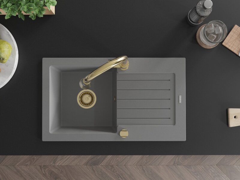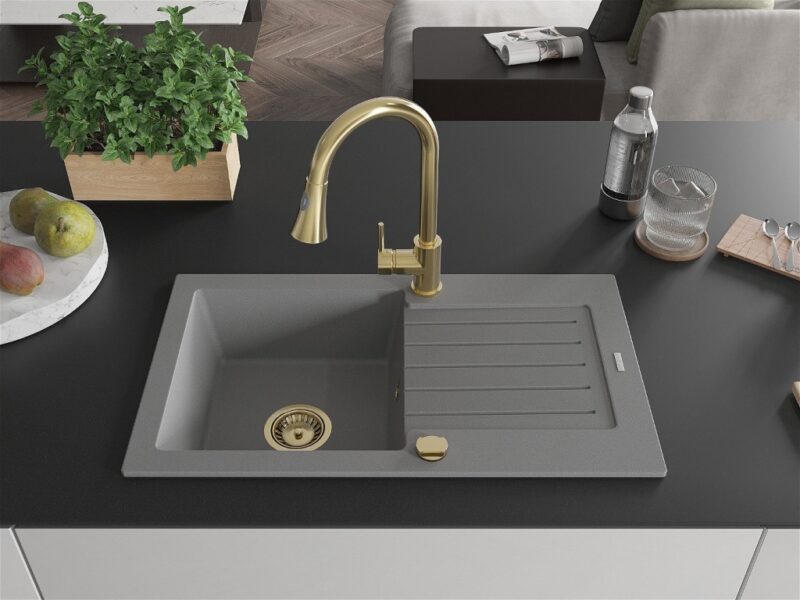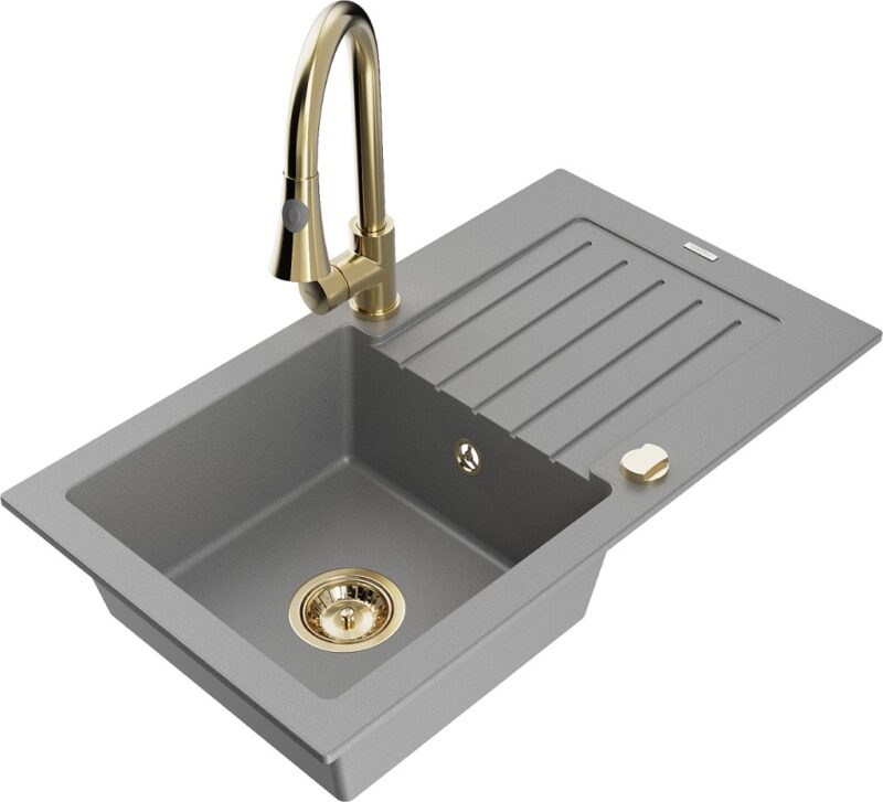 Technické dáta: drez: Rozmer: 752 x 436 x 161 mm Hĺbka komory: 151 mm Rozmery komory: 356×332 mm Priemer odtoku: ø90 mm Typ: 1-miska s odkvapkávačom Typ: Zapustené do pracovnej dosky Šedá farba Povrchová úprava sifónu: zlatá Materiál: žula (80% žulové kamenivo, 20% živice) Prepadový otvor: Áno Otvory: (batérie, automatické) 2 Inštalácia: Univerzálna, je možné inštalovať s odkvapkávačom na ľavú alebo pravú stranu Vysoká odolnosť proti poškriabaniu a zmene farby Odolnosť proti tepelným šokom Ľahko čistiteľný povrch Dva dodatočné vyfrézované otvory na samodierovanie ø35 kuchynská batéria: Materiál: mosadz Farba: Zlatá Hlava: Keramická Prevzdušňovač: Áno Typ: Jedna páka Výška batérie: 380 mm Rozsah výtoku: 252 mm Typ výtoku: Výsuvný(GT) Ean: 5905315029461
