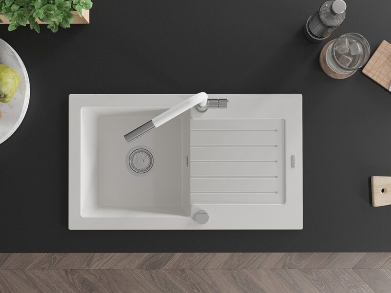 Technické dáta: drez: Rozmer: 752 x 436 x 161 mm Hĺbka komory: 151 mm Rozmery komory: 356×332 mm Priemer odtoku: ø90 mm Typ: 1-miska s odkvapkávačom Typ: Zapustené do pracovnej dosky biela farba Povrchová úprava sifónu: Chrome Materiál: žula (80% žulové kamenivo, 20% živice) Prepadový otvor: Áno Otvory: (batérie, automatické) 2 Inštalácia: Univerzálna, je možné inštalovať s odkvapkávačom na ľavú alebo pravú stranu Vysoká odolnosť proti poškriabaniu a zmene farby Odolnosť proti tepelným šokom Ľahko čistiteľný povrch Dva dodatočné vyfrézované otvory na samodierovanie ø35 kuchynská batéria: Materiál: mosadz Farba: chróm/biela Hlava: Keramická Prevzdušňovač: Áno Typ: Jedna páka Rozsah výtoku: 245 mm Výška batérie: 307 mm(GT) Ean: 5905315059468