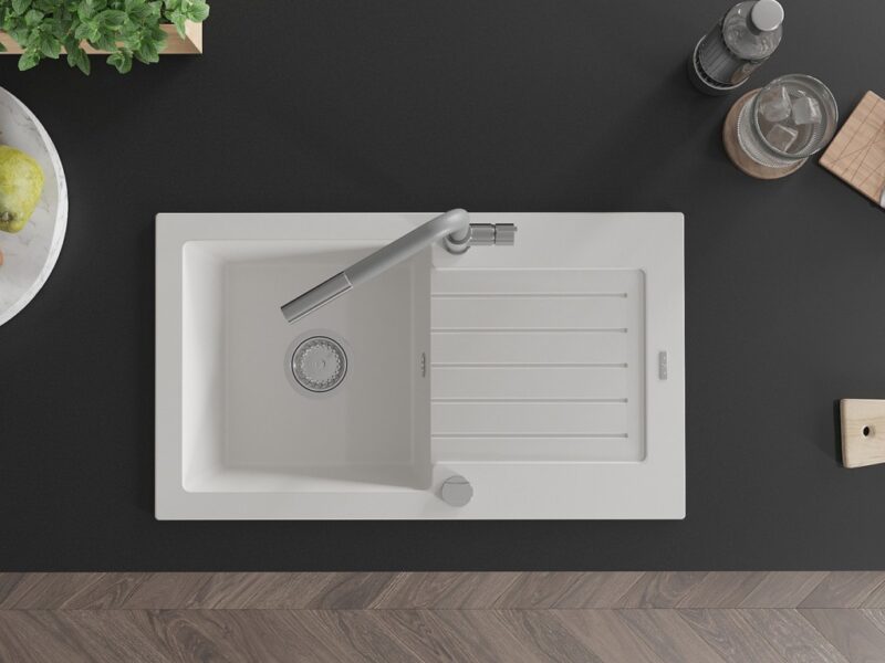 Technické dáta: drez: Rozmer: 752 x 436 x 161 mm Hĺbka komory: 151 mm Rozmery komory: 356×332 mm Priemer odtoku: ø90 mm Typ: 1-miska s odkvapkávačom Typ: Zapustené do pracovnej dosky biela farba Povrchová úprava sifónu: Chrome Materiál: žula (80% žulové kamenivo, 20% živice) Prepadový otvor: Áno Otvory: (batérie, automatické) 2 Inštalácia: Univerzálna, je možné inštalovať s odkvapkávačom na ľavú alebo pravú stranu Vysoká odolnosť proti poškriabaniu a zmene farby Odolnosť proti tepelným šokom Ľahko čistiteľný povrch Dva dodatočné vyfrézované otvory na samodierovanie ø35 kuchynská batéria: Materiál: mosadz Farba: chróm/sivá Hlava: Keramická Prevzdušňovač: Áno Typ: Jedna páka Rozsah výtoku: 245 mm Výška batérie: 307 mm(GT) Ean: 5905315059475