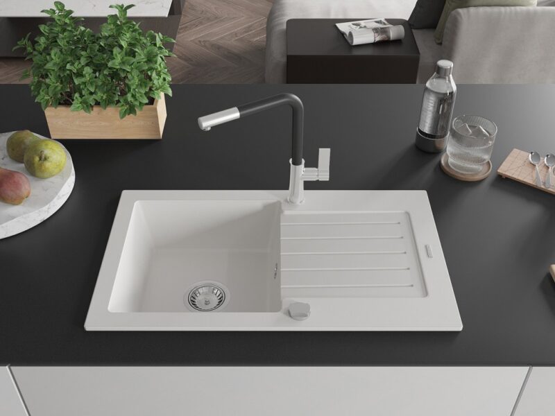 Technické dáta: drez: Rozmer: 752 x 436 x 161 mm Hĺbka komory: 151 mm Rozmery komory: 356×332 mm Priemer odtoku: ø90 mm Typ: 1-miska s odkvapkávačom Typ: Zapustené do pracovnej dosky biela farba Povrchová úprava sifónu: Chrome Materiál: žula (80% žulové kamenivo, 20% živice) Prepadový otvor: Áno Otvory: (batérie, automatické) 2 Inštalácia: Univerzálna, je možné inštalovať s odkvapkávačom na ľavú alebo pravú stranu Vysoká odolnosť proti poškriabaniu a zmene farby Odolnosť proti tepelným šokom Ľahko čistiteľný povrch Dva dodatočné vyfrézované otvory na samodierovanie ø35 kuchynská batéria: Materiál: mosadz Farba: chróm/čierna Hlava: Keramická Prevzdušňovač: Áno Typ: Jedna páka Rozsah výtoku: 245 mm Výška batérie: 307 mm(GT) Ean: 5905315059482
