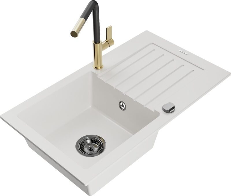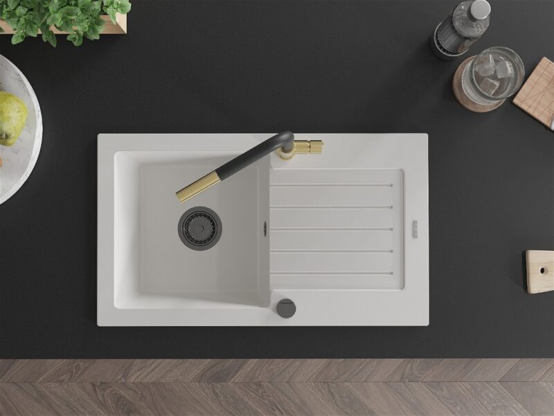 MEXEN/S MEXEN/S – Pablo granitový drez 1 s odkvapkávačom vrátane batérie Flora, biela 6510-20-670401-57-B